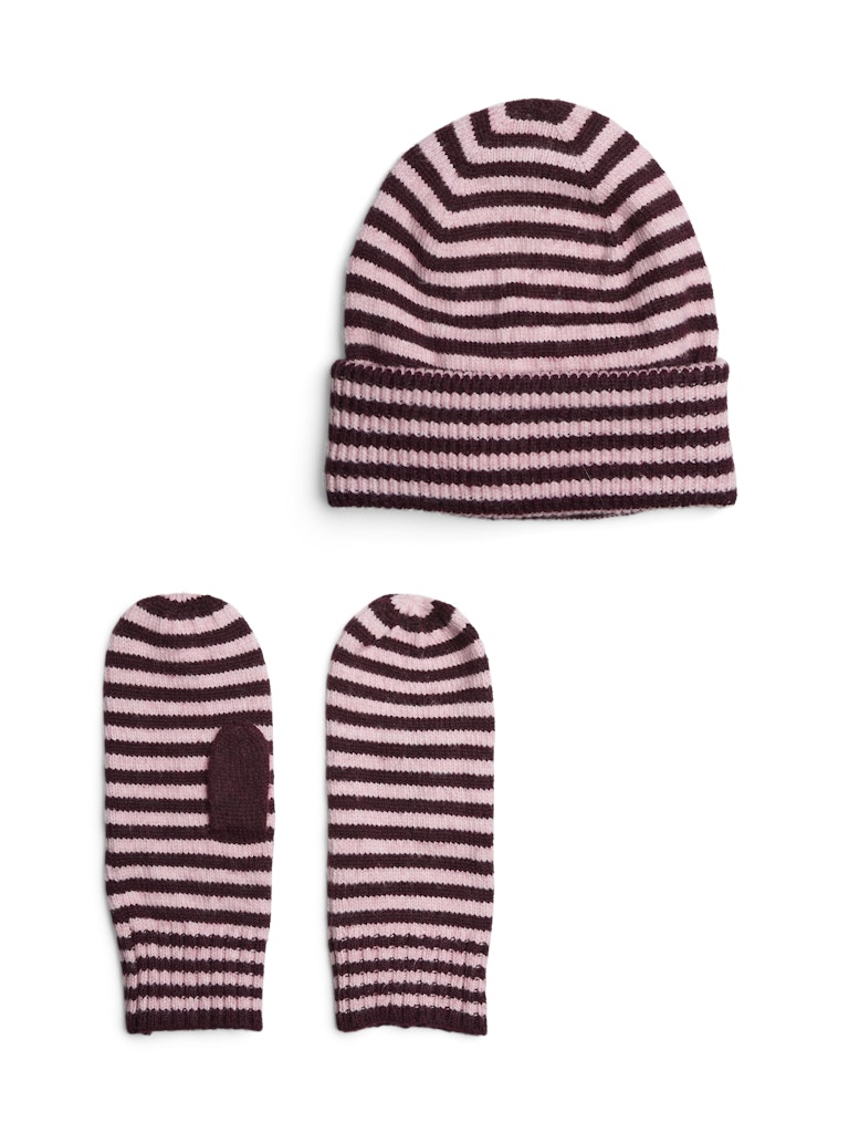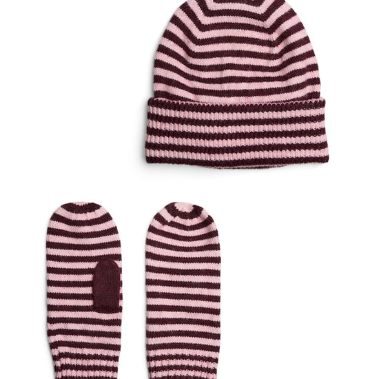 Sæt med hue og vanter i skønne farver i en blød blanding af recycled polyester og polyester. Vinrød og lyserød combi.