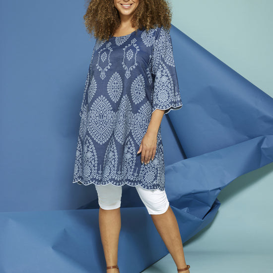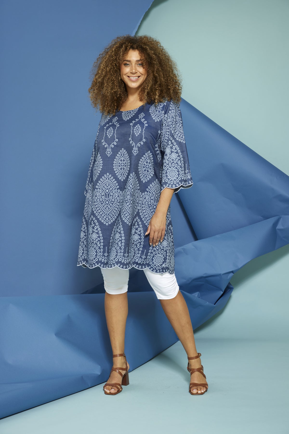 Med sin allsidige passform kan denne tunikaen styles opp eller ned, perfekt for både hverdagsbruk og avslappede begivenheter. Den runde halsutskjæringen og trekvartlange ermer gjør den ideell for lag-på-lag styling. Kombiner den med et par leggings eller jeans for et komplett utseende.