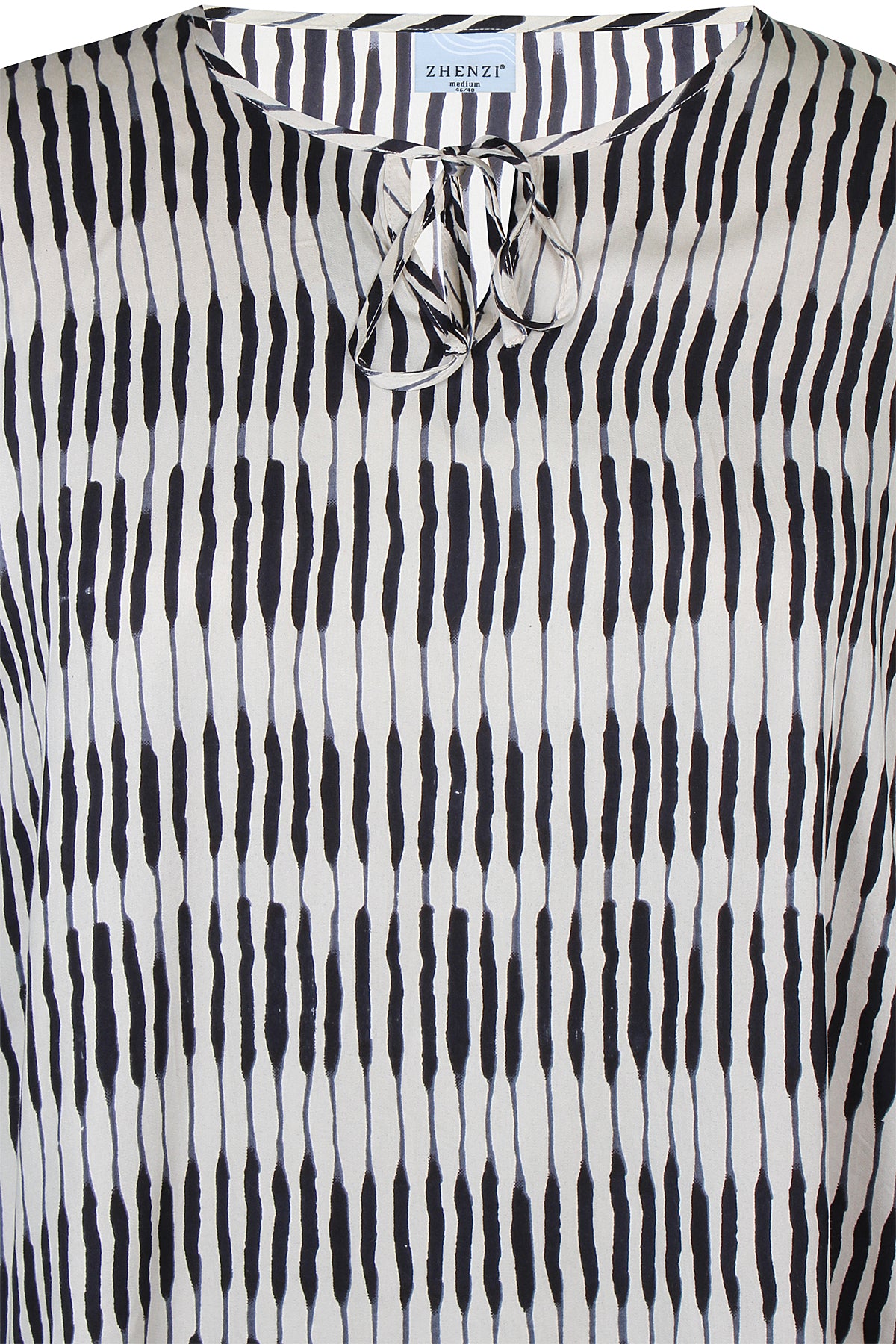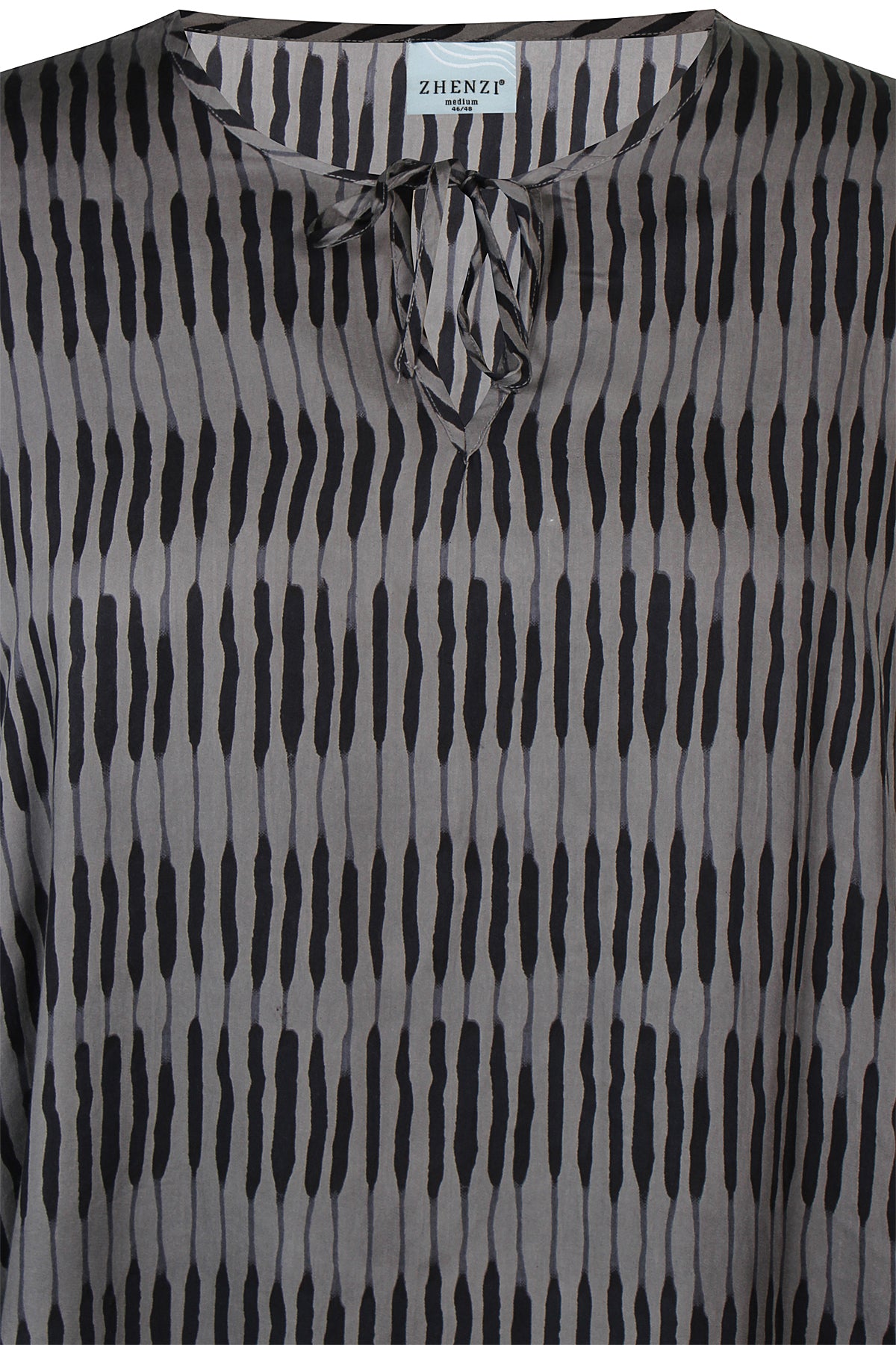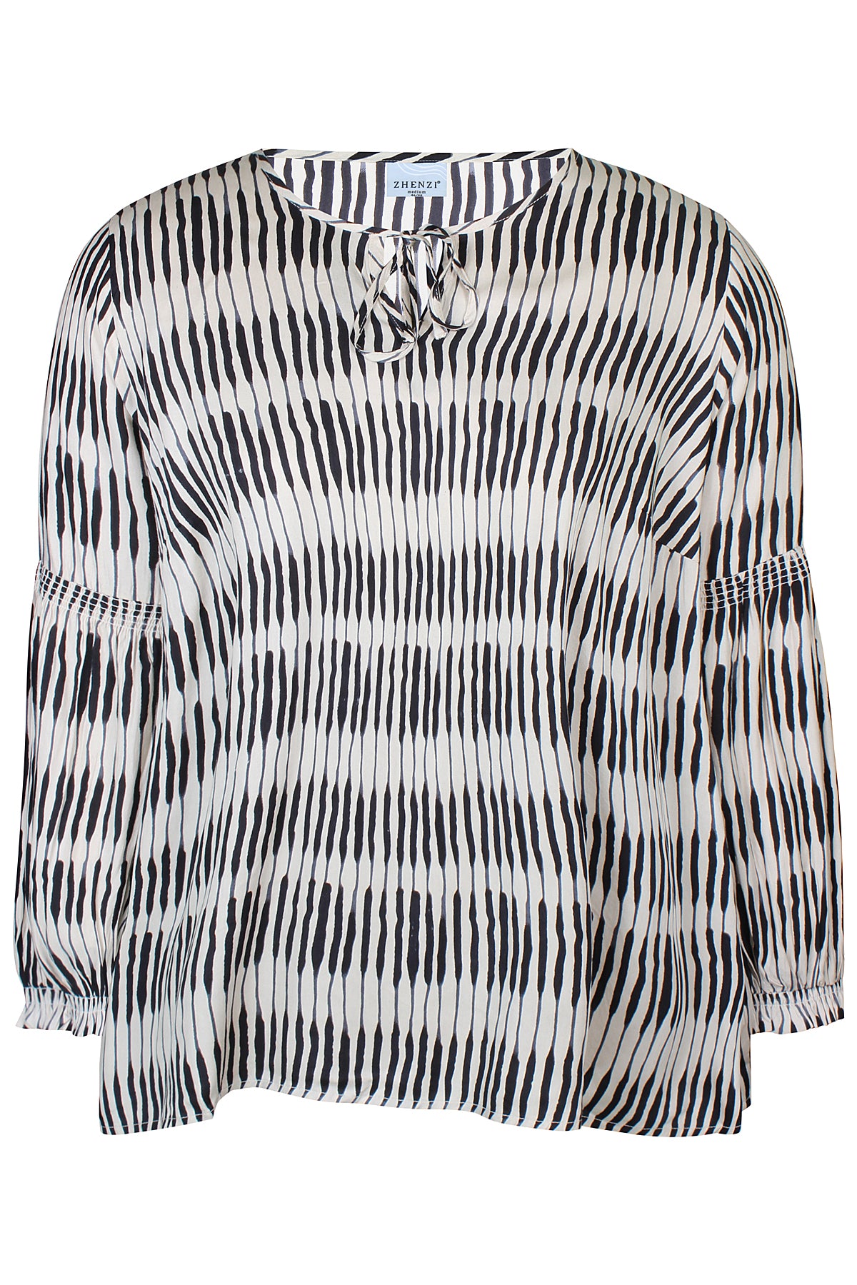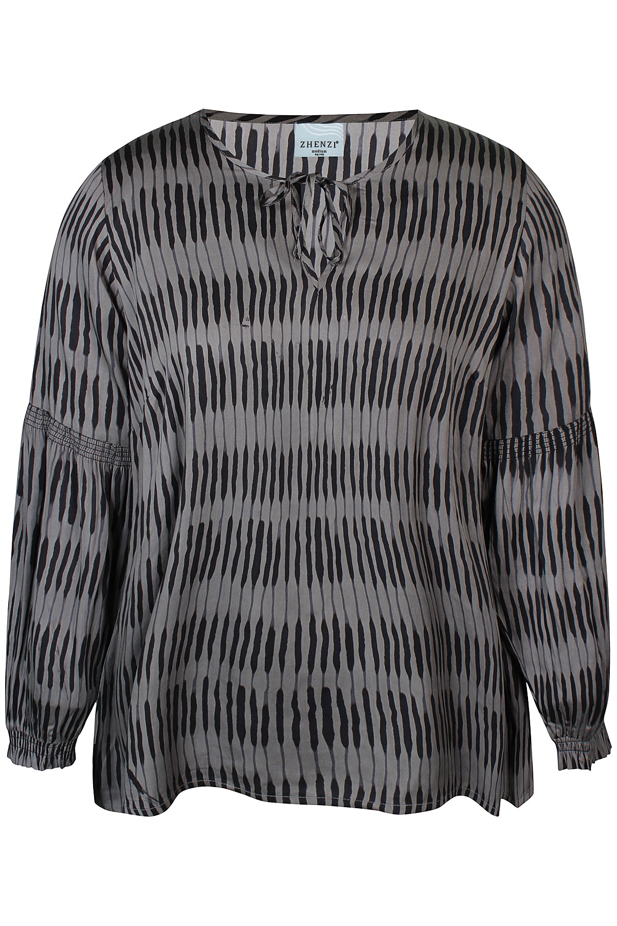 Denne blusen fra Zhenzi kombinerer moderne design med maksimal komfort. Den er laget i 100% viskose som føles lett og myk mot huden, og har et grafisk batikmønster i fargene Sandshell og Stone Green.