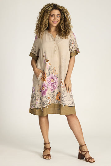 Kjolens design med det fargerike blomstermønsteret på en nøytral basisfarge skaper en harmonisk balanse mellom eleganse og livlighet. De korte ermene og V-formede halsutskjæringen med knappestolpe gir mulighet for personlig styling. Kombiner kjolen med dine favorittsandaler eller -støvler for et komplett utseende.