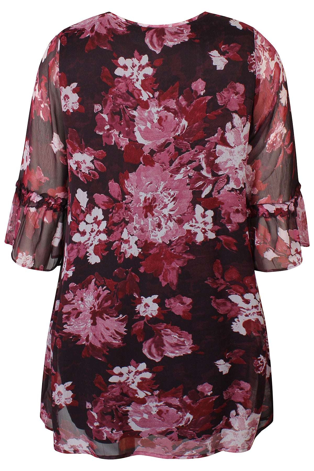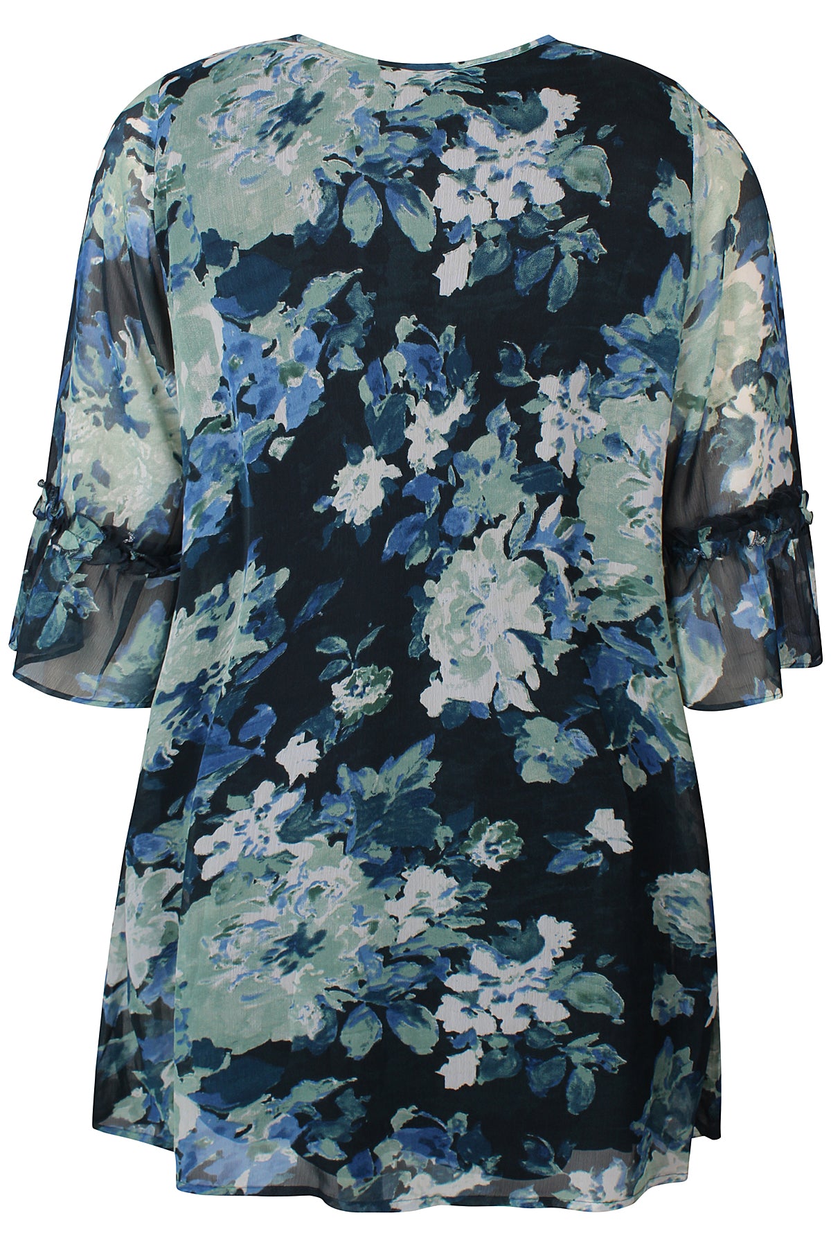 - Trekvartlange ermer med dekorative volanger