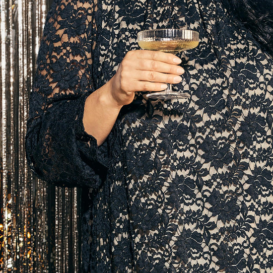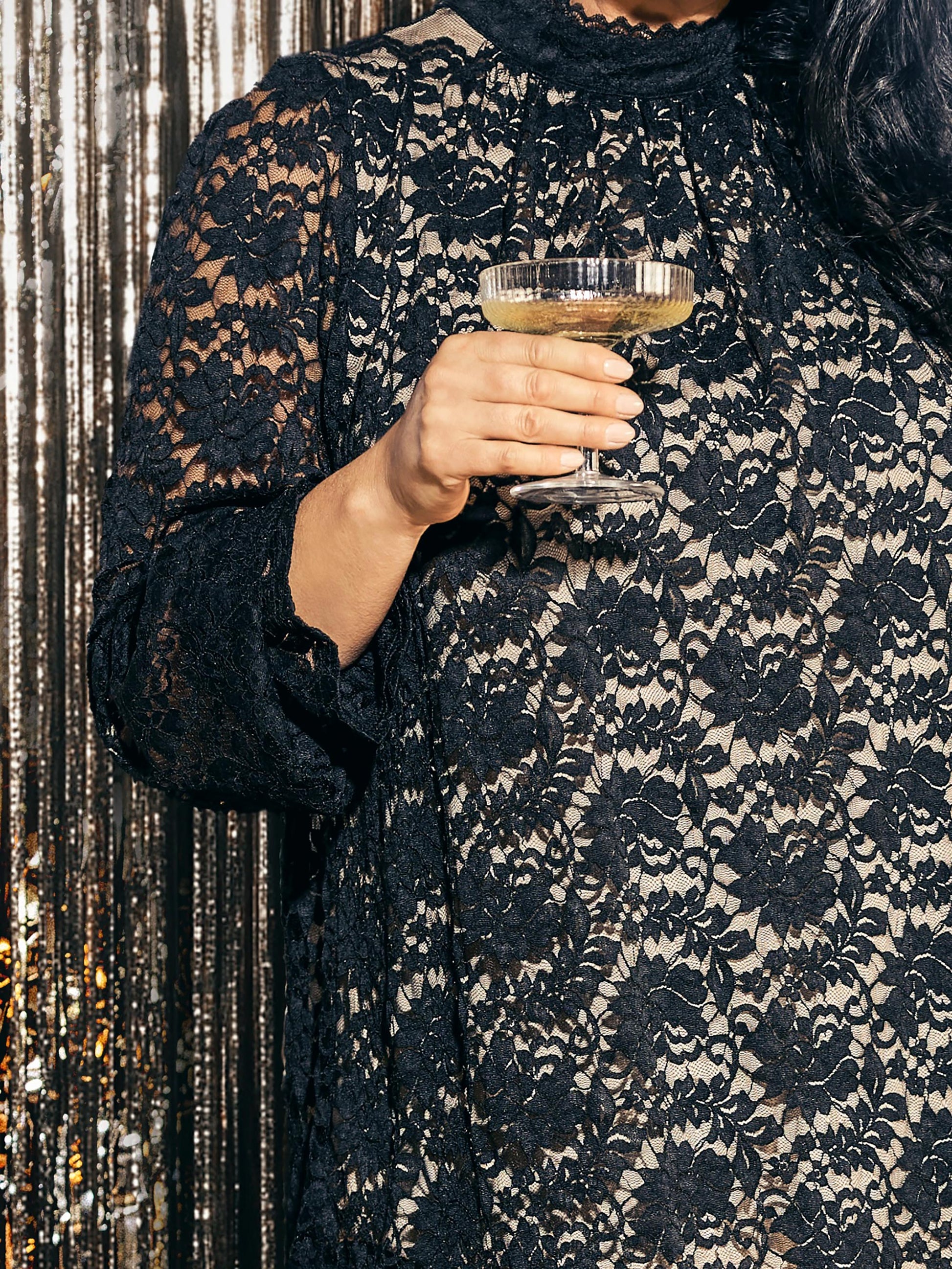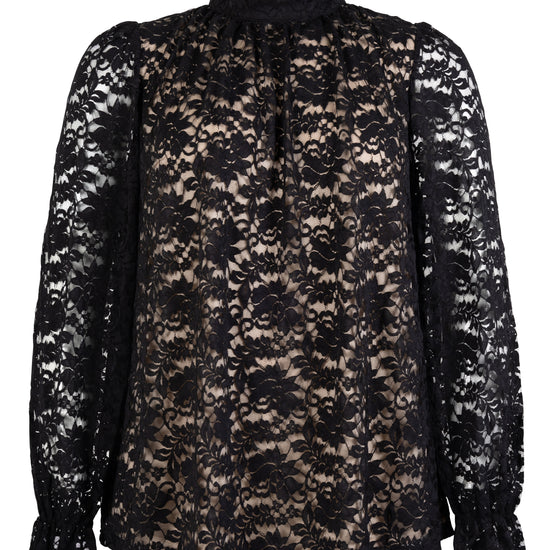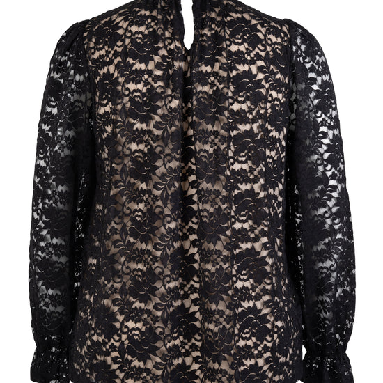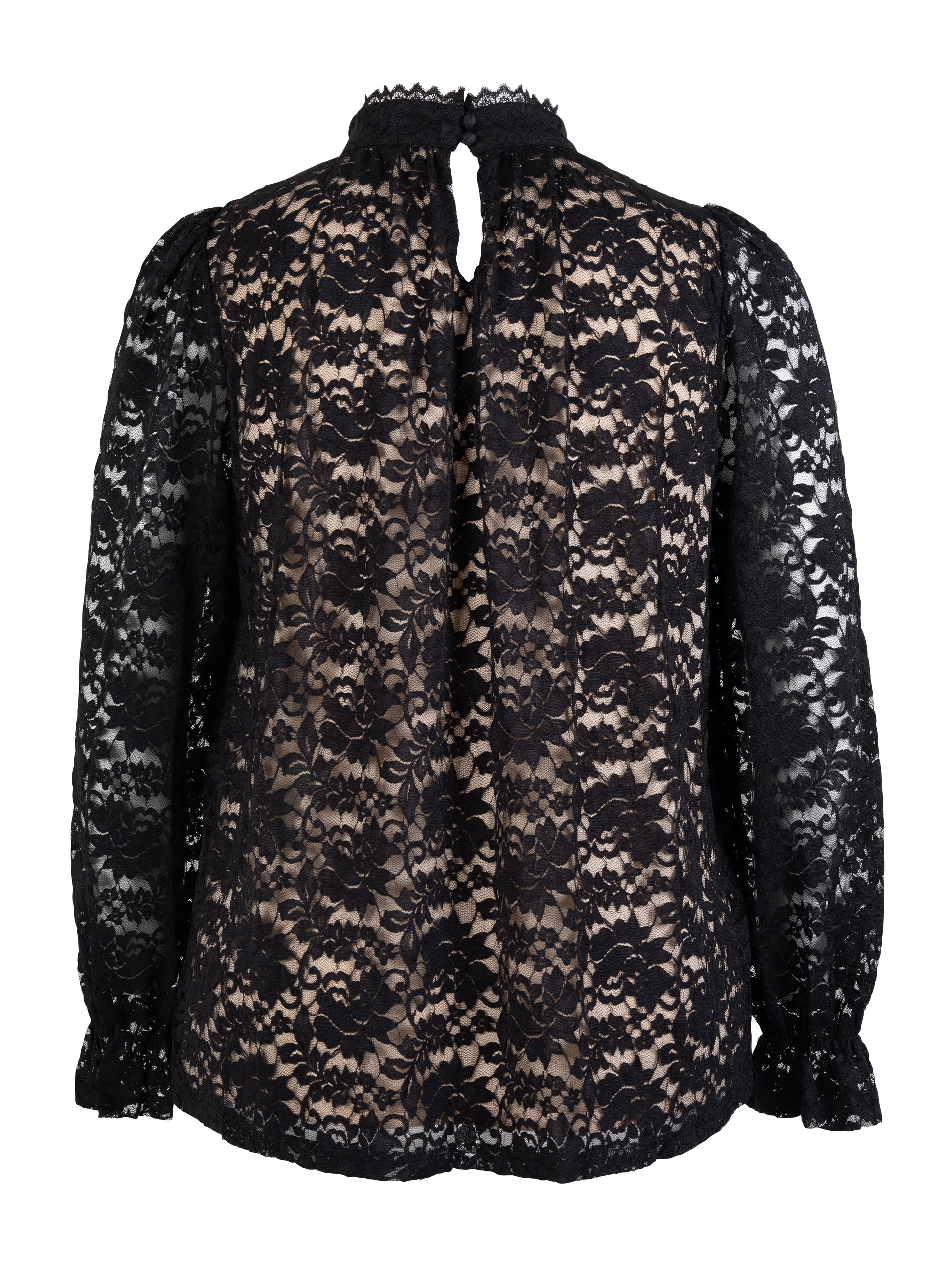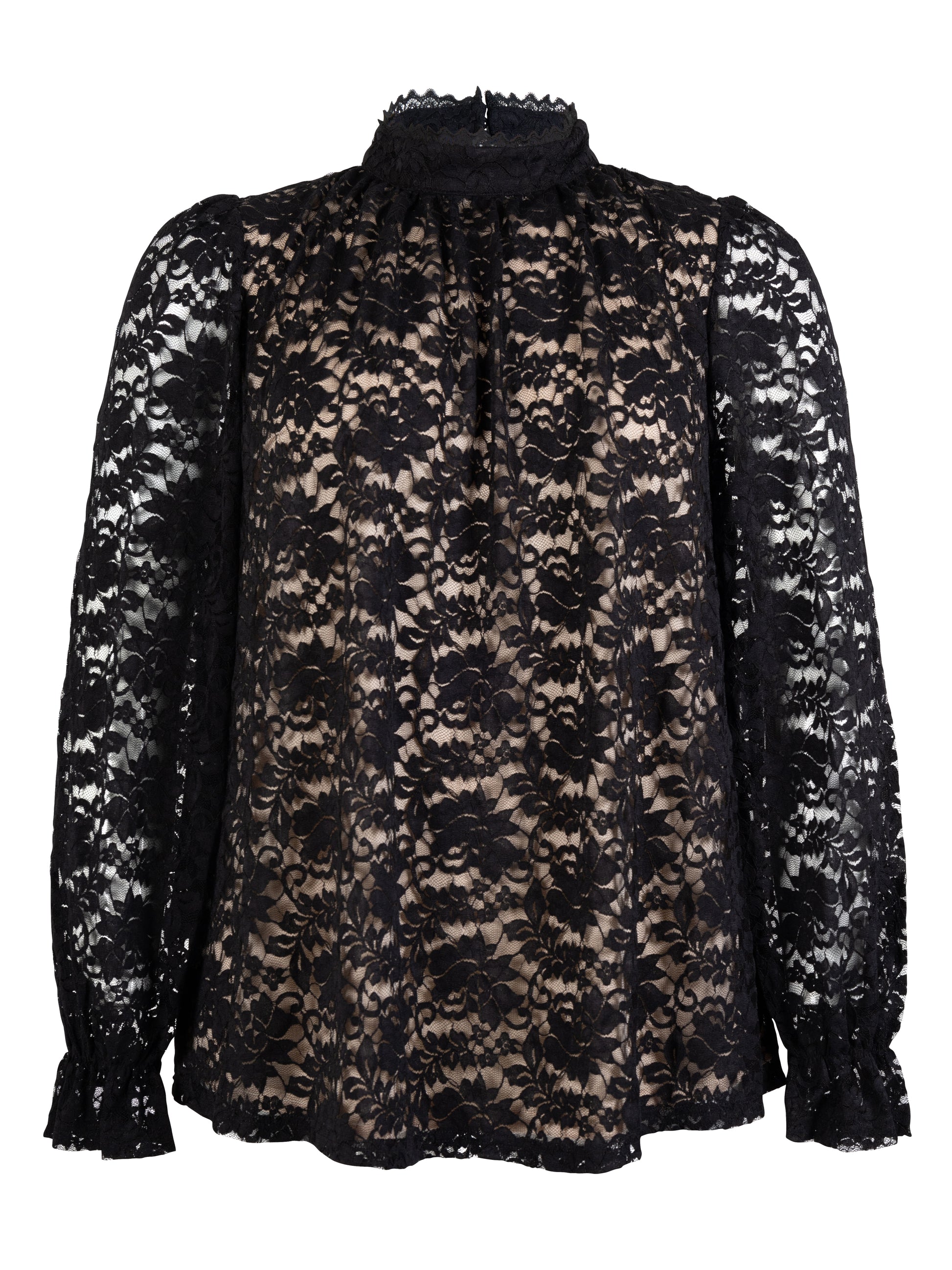 La garderoben din skinne med denne sofistikerte sorte blondeblusen fra ZOEY. Designet har et gjennomgående blomsterblonde-mønster som gir et feminint og raffinert uttrykk. Blusen kombinerer en lett transparent finish med høy blondekrage og lange ermer med elegant vidde.