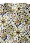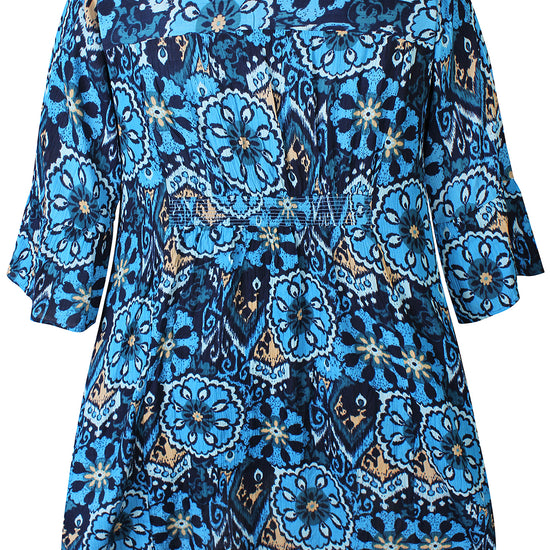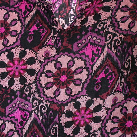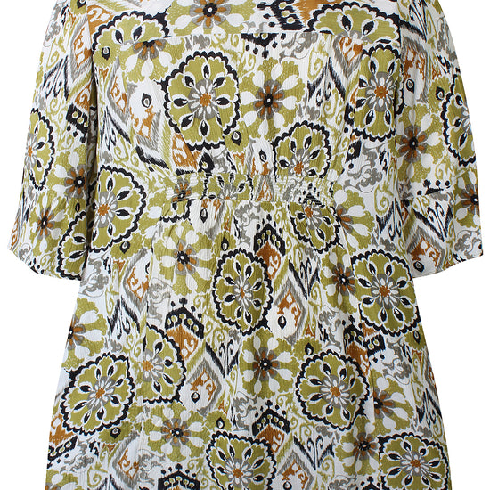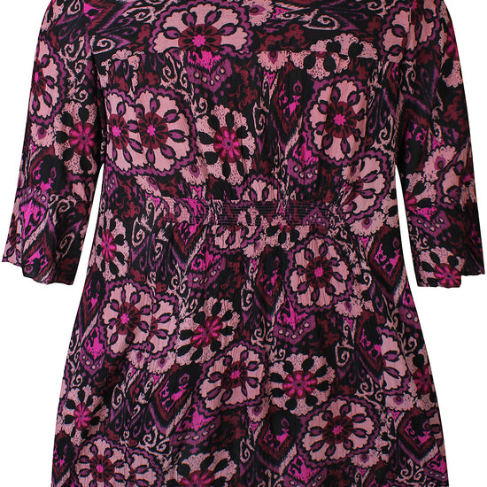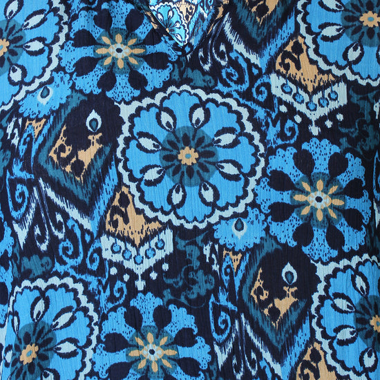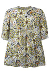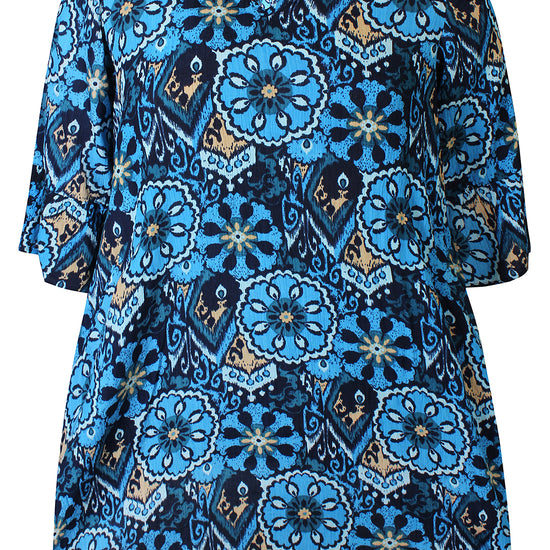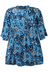 ZHENZI kjolen er en smuk kombination af farver og mønstre, der gør den til et uundgåeligt blikfang i enhver garderobe. Kjolen har en A-line silhuet, der falder løst og flot omkring kroppen, og er skabt i et let og luftigt materiale, som sikrer maksimal komfort hele dagen. Med et levende mønster i blå, grøn og pink nuancer, prydet med geometriske og blomsterinspirerede motiver, tilføjer denne kjole et strejf af eksotisk og kunstnerisk flair til dit look.