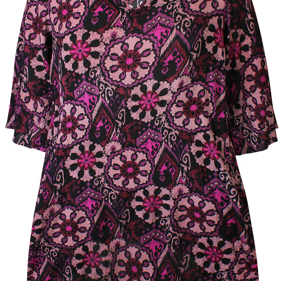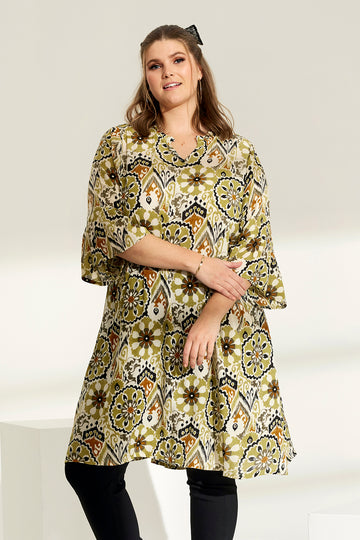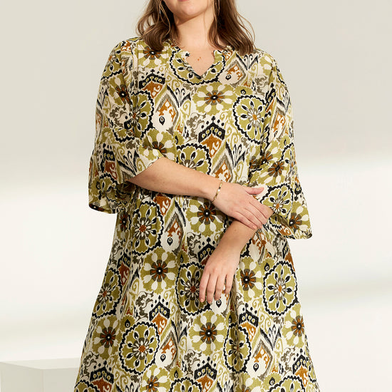 Kjolen har en elegant V-udskæring, der fremhæver en feminin og sofistikeret stil. De trekvartlange ærmer med let klokkeform giver kjolen et bohemeagtigt og afslappet udtryk. Den løse pasform sikrer bevægelsesfrihed og komfort, hvilket gør kjolen ideel til både hverdagsbrug og særlige anledninger. Style den med sorte leggings for et komplet look, der nemt kan tilpasses forskellige sæsoner og lejligheder.