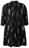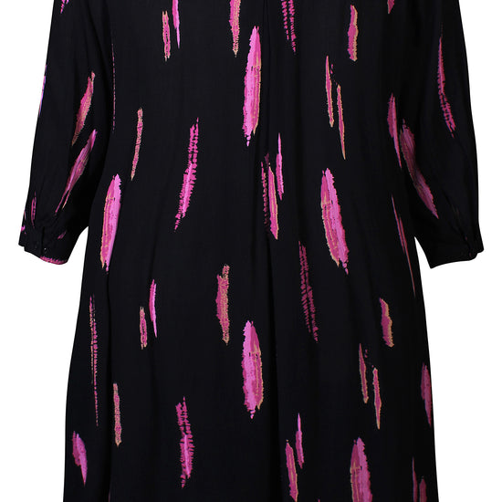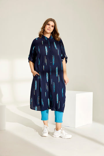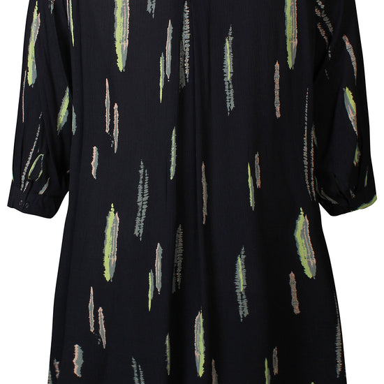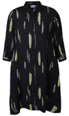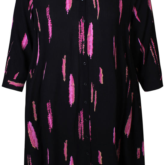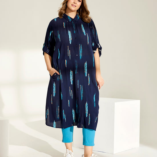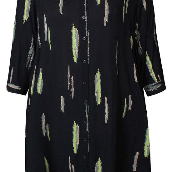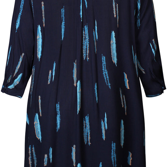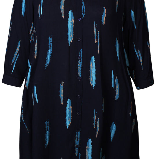 Denne kjole har en løs pasform, der sikrer bevægelsesfrihed og komfort hele dagen. Med en klassisk skjortekrave og knaplukning foran kan du nemt style kjolen op eller ned alt efter anledningen. Ærmerne er trekvartlange med justerbare knapstropper, der giver dig mulighed for at tilpasse looket. Praktiske sidelommer tilføjer et afslappet touch, mens kjolens længde lige under knæet gør den ideel til både hverdag og fest.