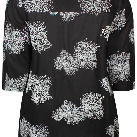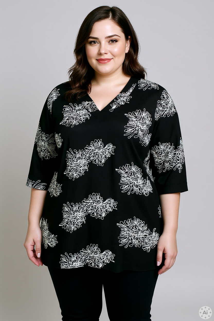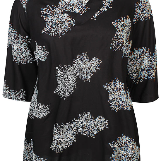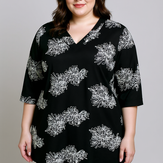 Med sin klassiske sorte farve og kunstneriske mønster er denne tunika et alsidigt stykke tøj, der nemt kan styles til både afslappede dage og mere formelle begivenheder. Den elegante V-halsudskæring og de små slidser i siderne tilføjer et sofistikeret touch, mens den lette viskose sikrer, at du føler dig godt tilpas hele dagen.