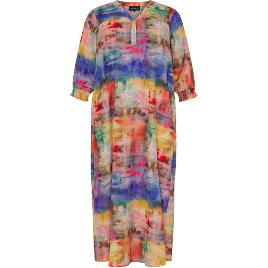 Oplev den smukke og farverige lange kjole fra NO. 1 BY OX, der kombinerer elegance med komfort. Denne kjole er designet i et iøjnefaldende print i de smukkeste farver, der vil få dig til at stråle ved enhver lejlighed. Kjolen har en rund halsudskæring med en elegant V-åbning og enkelte knapper, som tilføjer et sofistikeret touch. De 3/4 lange ærmer med smockkanter giver en elegant puff-effekt, mens de skjulte sidelommer tilføjer funktionalitet. Den lette og luftige pasform gør kjolen ideel til både hverdagsbrug og festlige anledninger.