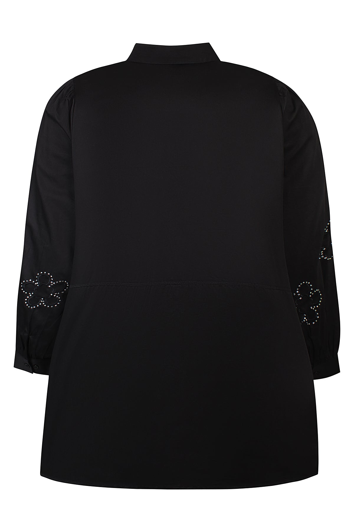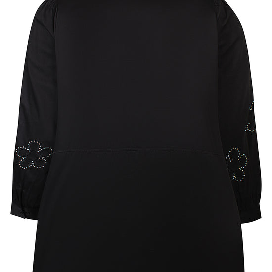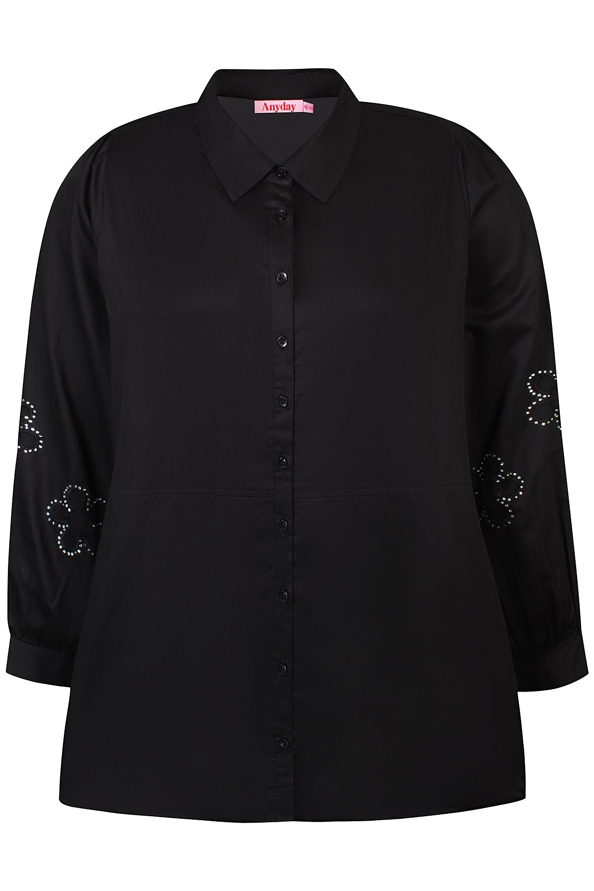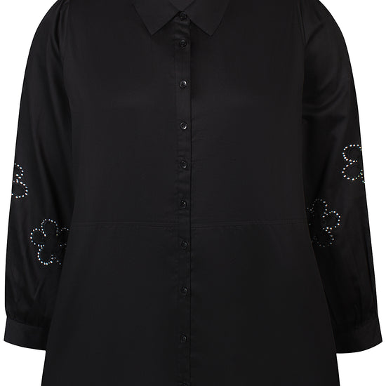 Denne elegante model fra Anyday kombinerer det traditionelle skjortelook med feminine og iøjnefaldende detaljer. Skjorten har en klassisk krave og er gennemknappet hele vejen ned, men det er de unikke ærmer med blomstermotiver og små dekorative sten, der virkelig stjæler opmærksomheden. Den er fremstillet i ren bomuld, hvilket gør den både blød og åndbar at have på.