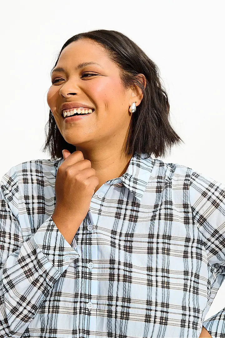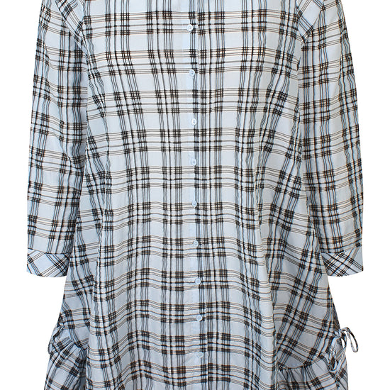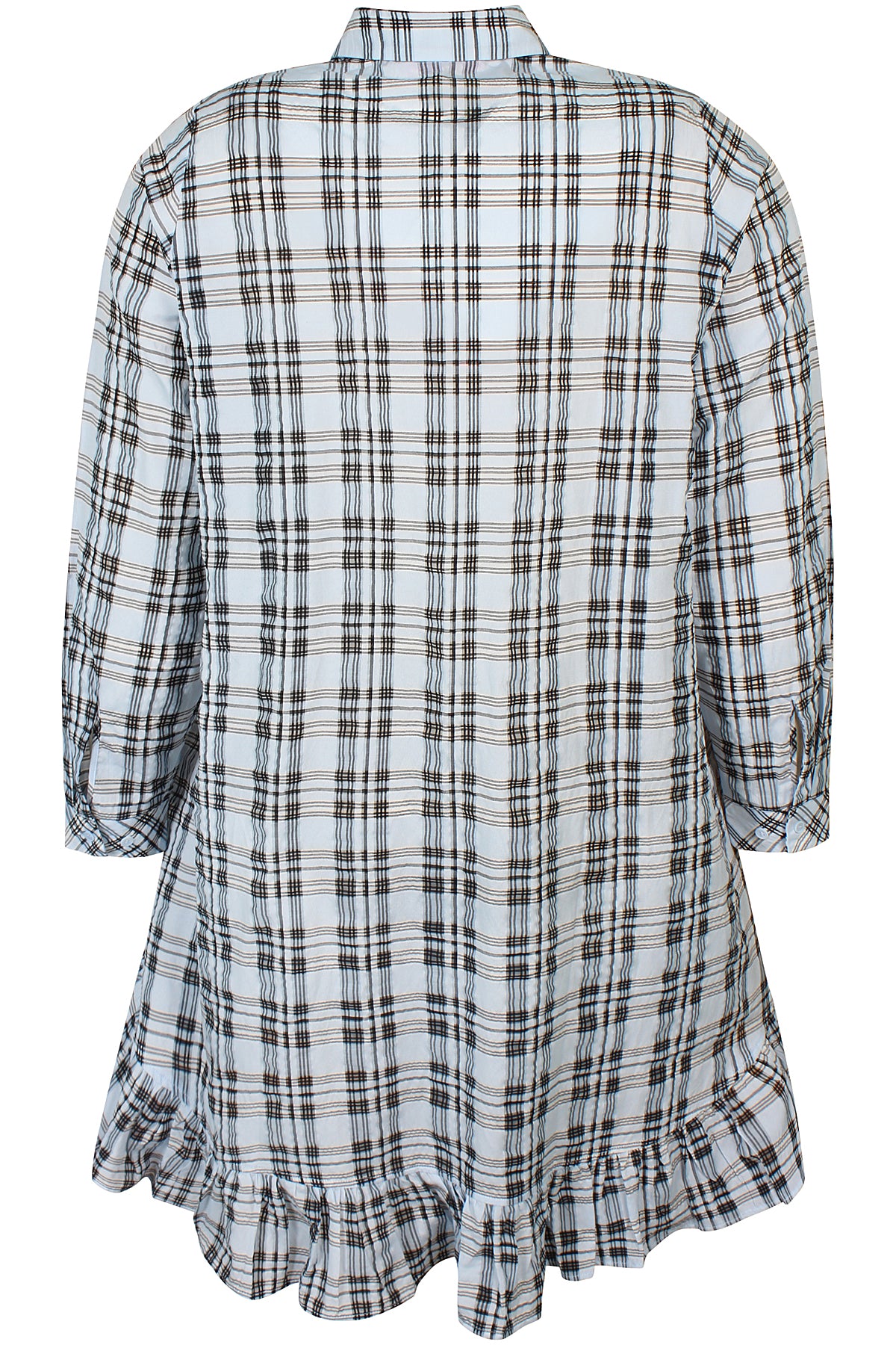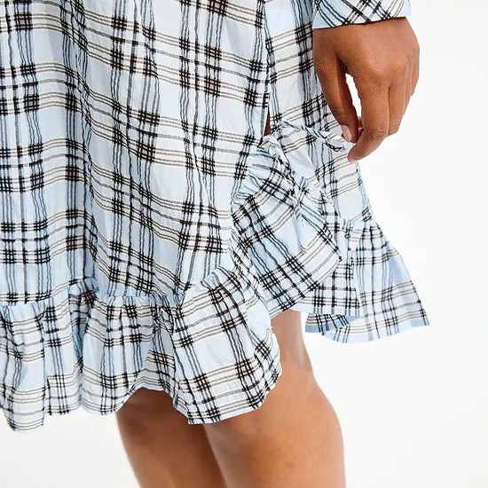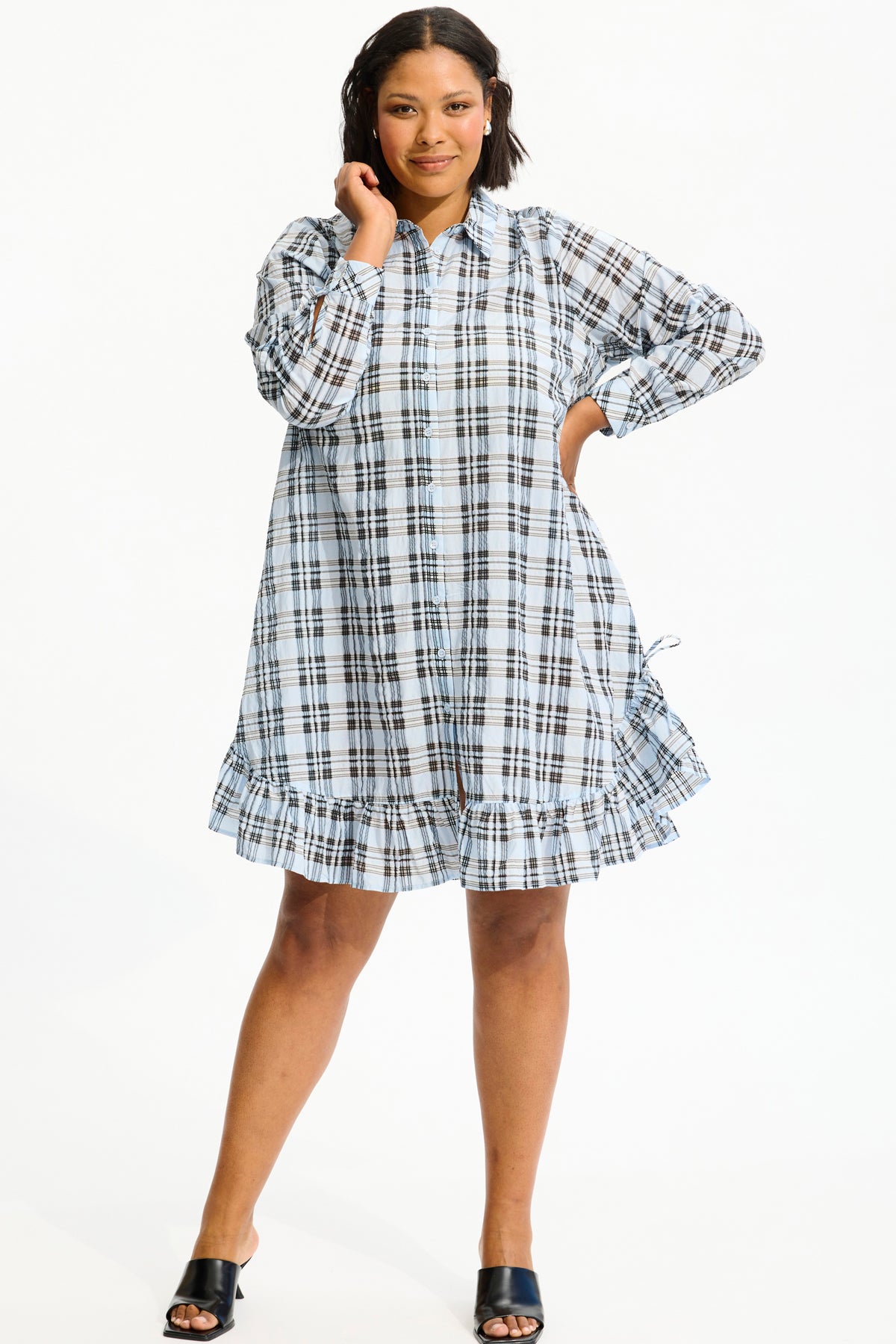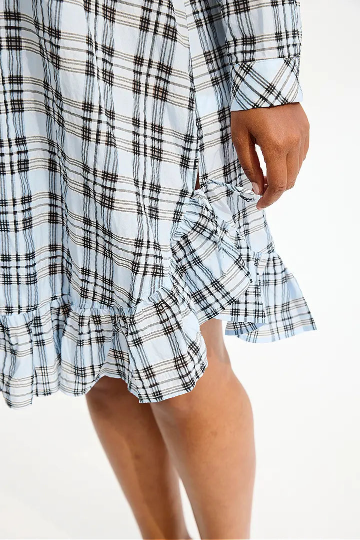 Denne flotte model fra Anyday er designet med et klassisk ternet mønster i farven Cashmere Blue, der giver et friskt og stilrent udtryk. Kjolen er udformet som en klassisk skjortekjole med en pæn krave, gennemgående knaplukning foran og lange ærmer med manchetter, mens den brede flæsekant i bunden tilføjer en feminin detalje. Materialet består af en blød blanding med højt bomulds-indhold, hvilket sikrer god komfort og holder pasformen pæn gennem hele dagen.