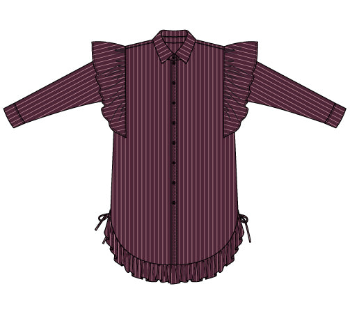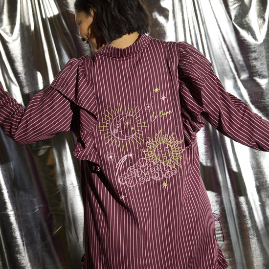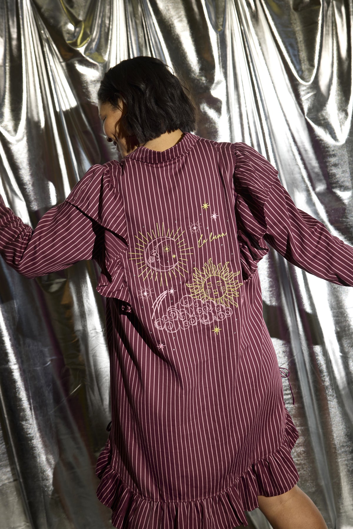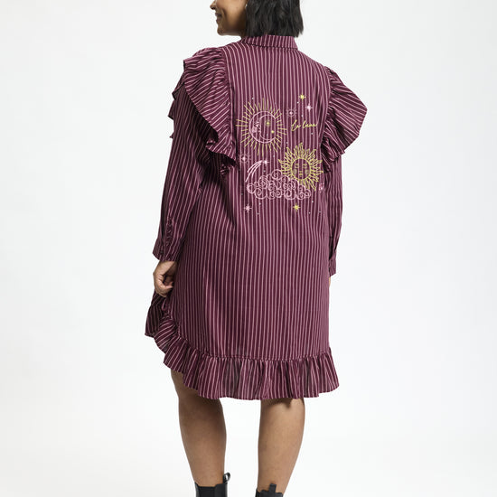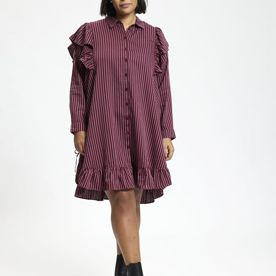 Fremhæv din stil med denne flotte stribede kjole fra ANYDAY. Kjolen er lavet i 100% bomuld og har et smukt maroon / bordeaux farvespil med rosa lodrette striber, som giver et slankt og elegant look. De karakteristiske flæser over skuldre og langs ærmerne samt den brede flæsekant forneden tilføjer et feminint touch, mens broderiet på bagsiden giver kjolen et eksklusivt og unikt udtryk.