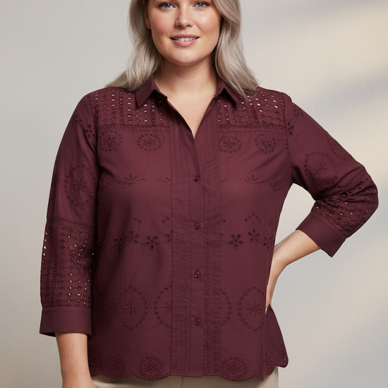 Giv din garderobe et feminint løft med denne smukke bordeaux bluse fra ONLY CARMAKOMA. Blusen er designet i let og glansfuldt poplinstof af 100% organisk bomuld, som føles blødt og behageligt mod huden. De dekorative broderie anglaise-detaljer på krop og ærmer tilføjer et elegant og delikat touch, mens den klassiske skjortekrave og knaplukningen skaber et tidløst udtryk.