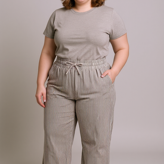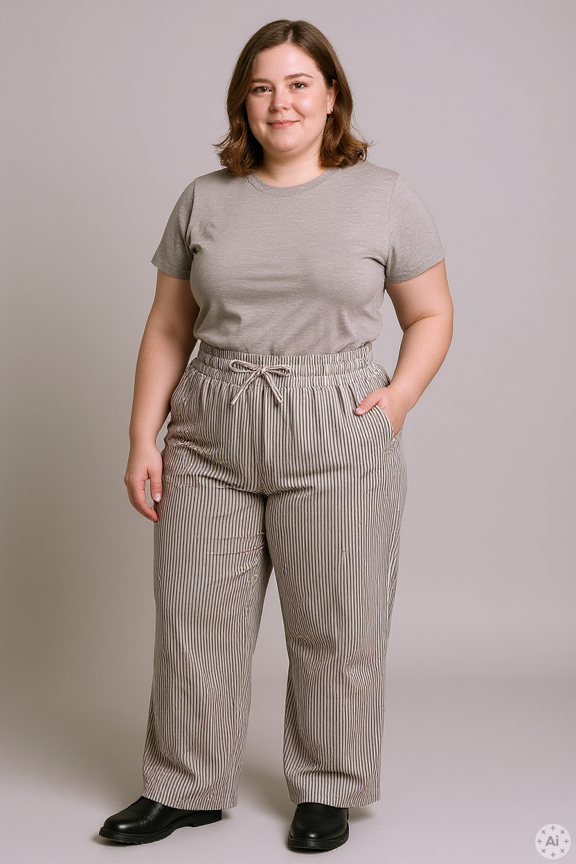 Det klassiske, smalle stribemønster og den beige nuance gør bukserne nemme at style til enhver lejlighed. Kombinér dem med en plus size t-shirt eller en plus size jakke for et fuldendt, afslappet look, der både er moderne og komfortabelt.