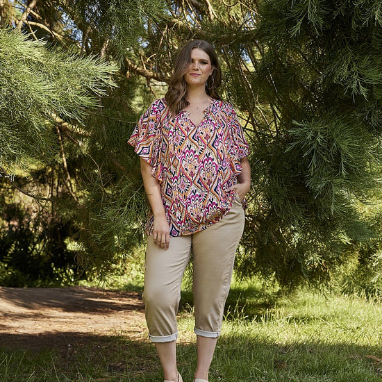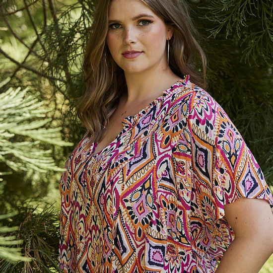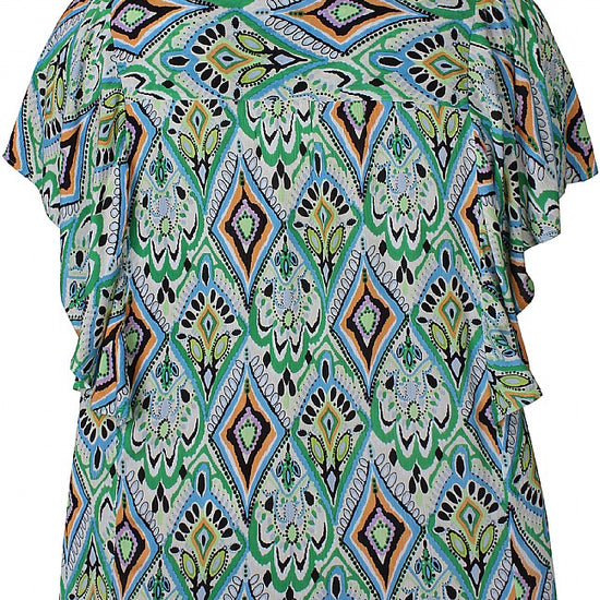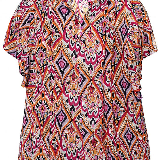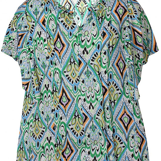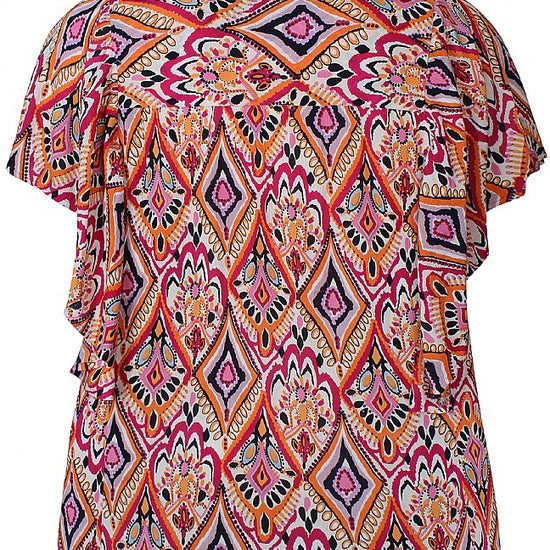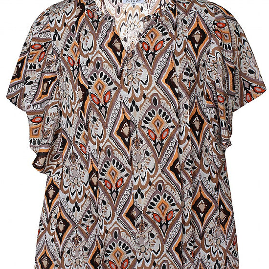 Printet bluse med flæsedetaljer i udskæringen. Korte ærmer. Knapper foran