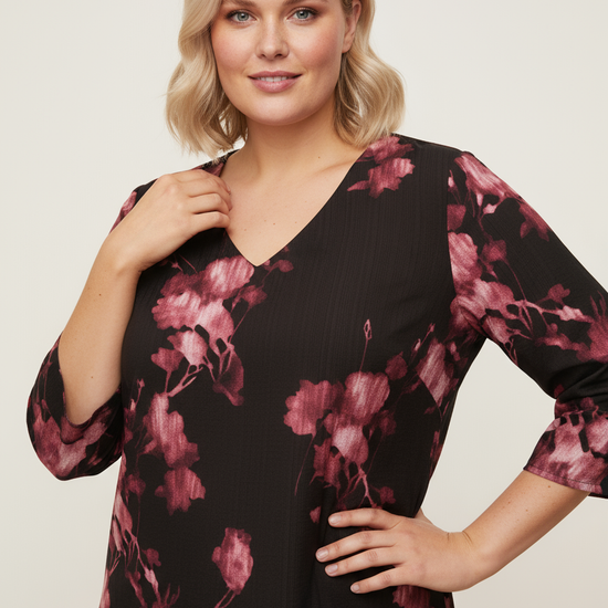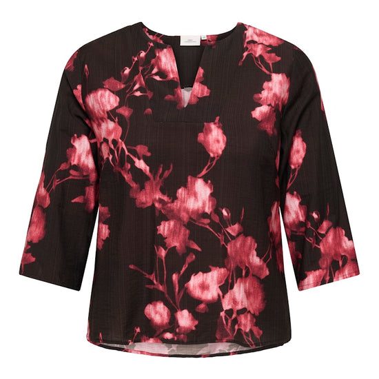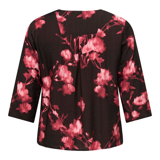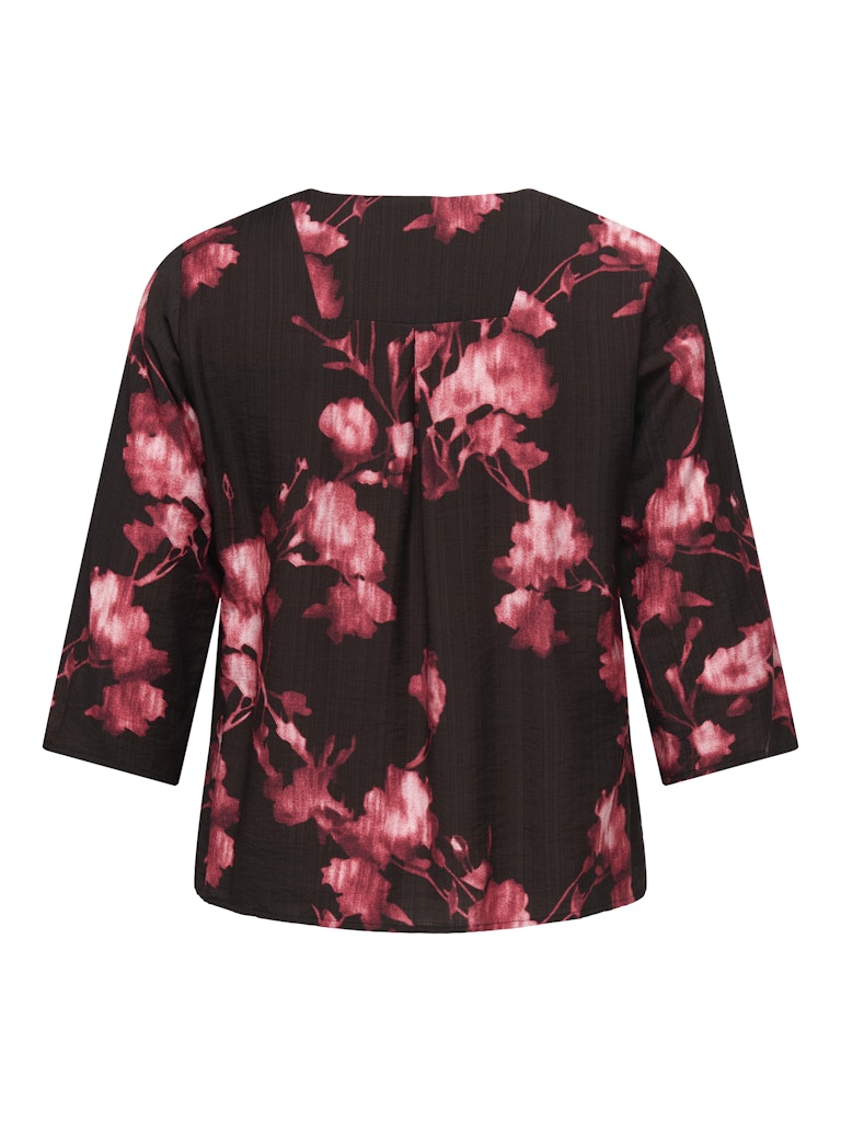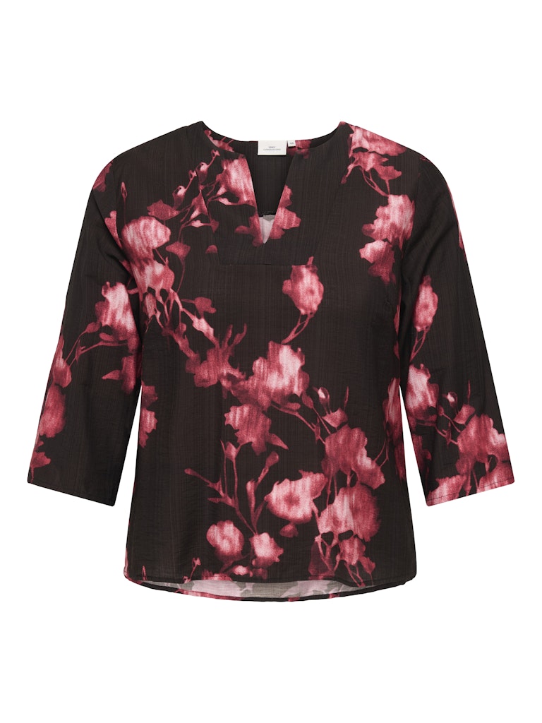 Denne top kombinerer en flatterende regular fit med et elegant all-over blomsterprint i smukke nuancer af rosa og rød på en dyb brunlig bund. De 3/4-lange ærmer og V-halsen giver et moderne og feminint udtryk, mens den bløde viskose-blanding sikrer en let og silkelignende finish, der falder smukt og levende.