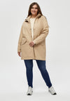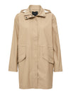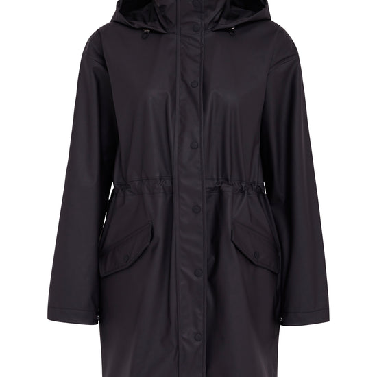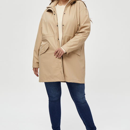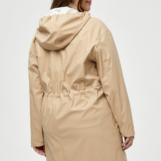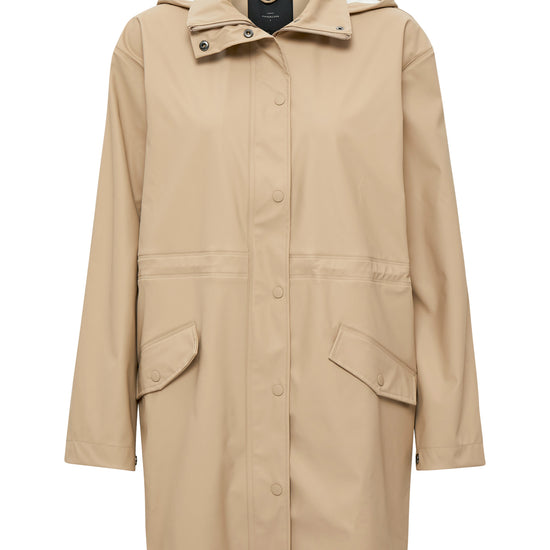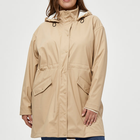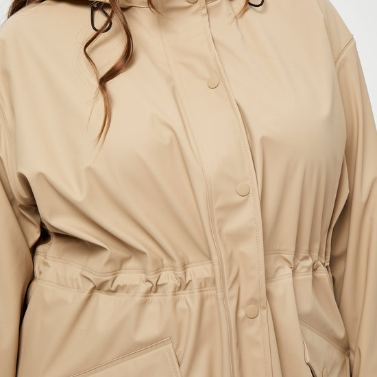 Regnjakken er udstyret med praktiske forlommer til opbevaring af dine småting, mens det elastiske snoretræk i taljen tillader dig at justere jakken for en mere feminin silhuet. Uanset om du vælger den klassiske sand eller den tidløse sort, er denne jakke en alsidig tilføjelse til enhver garderobe.
