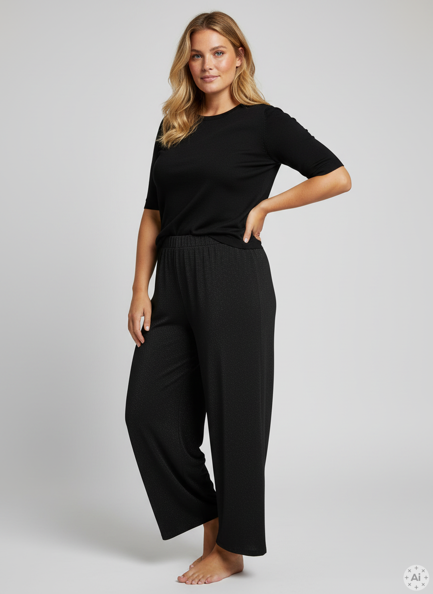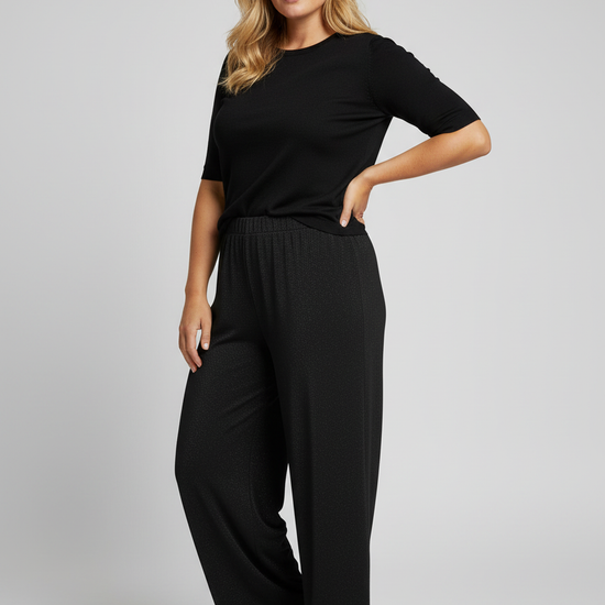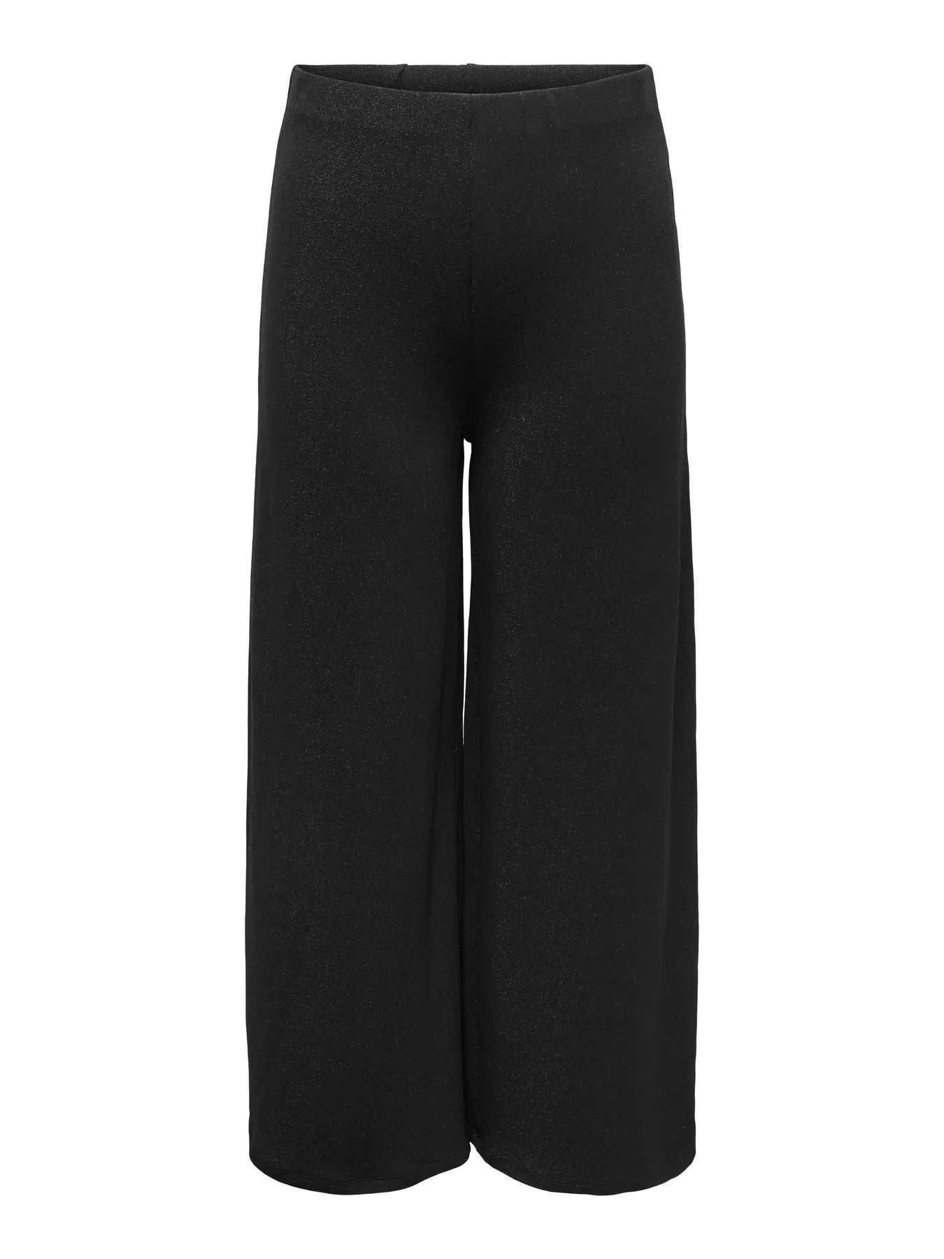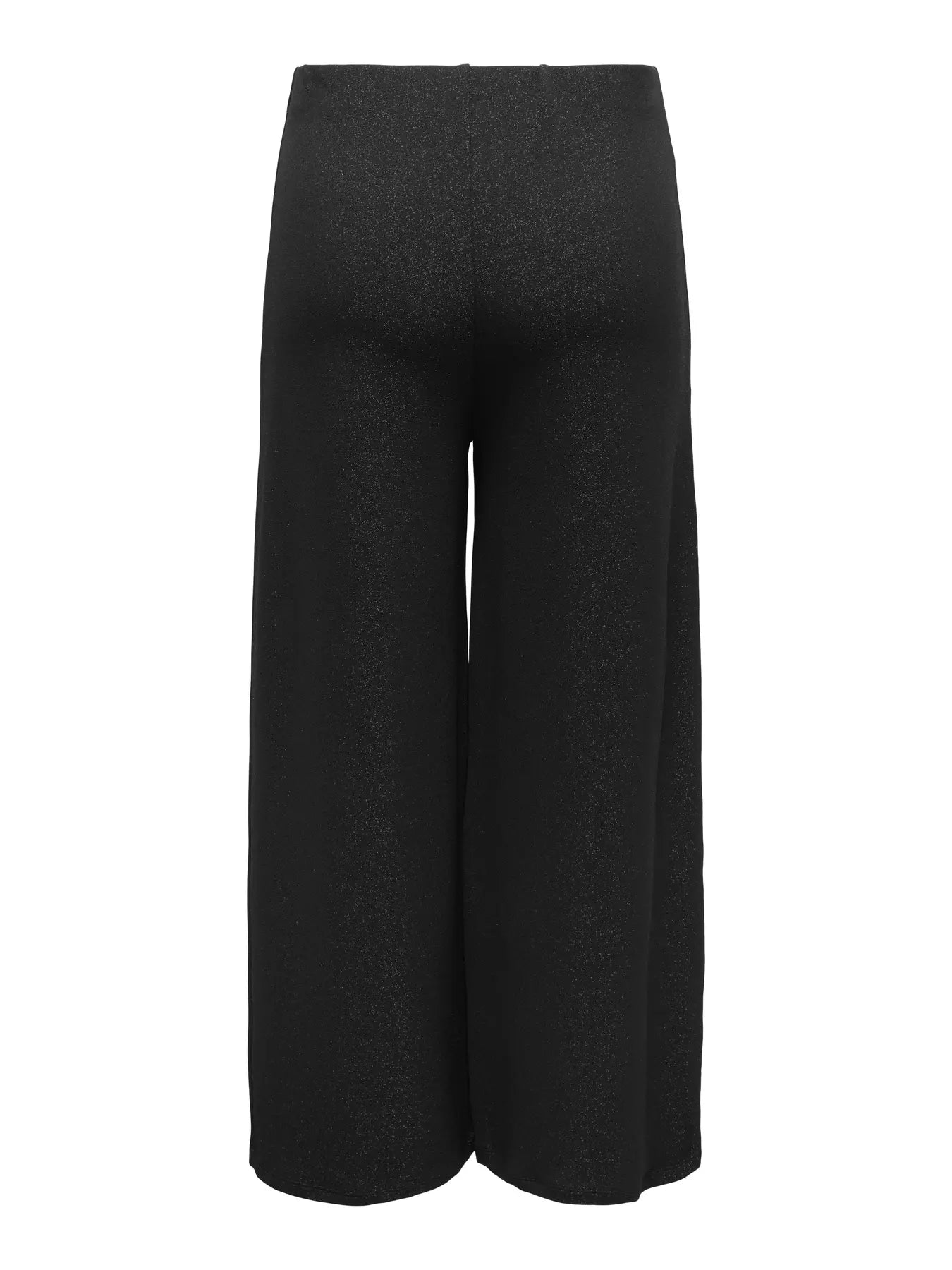 Disse sorte bukser fra ONLY CARMAKOMA er skabt til dig, der ønsker både komfort og et festligt twist i garderoben. Det bløde, strækbare jersey materiale giver dig fri bevægelighed og en behagelig følelse hele dagen. Med løs pasform og elastisk talje får du bukser, der sidder flot og føles lette – perfekt til både hverdag og fest.
