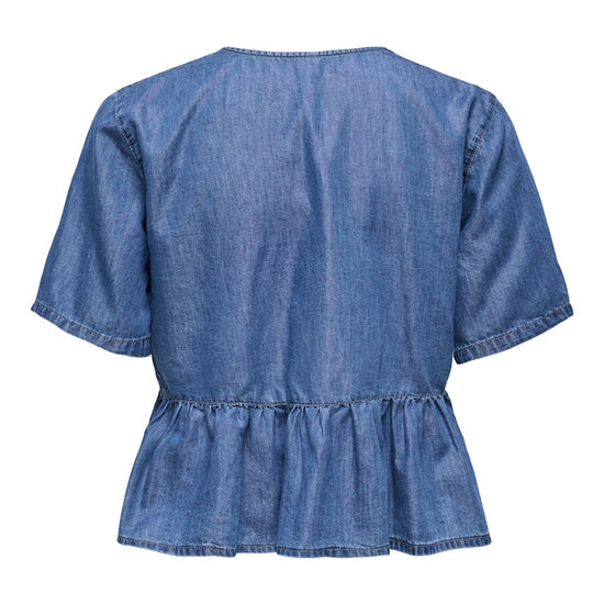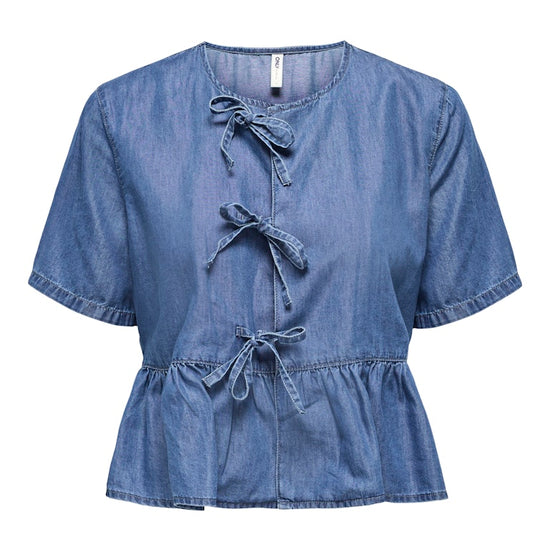 Denne skjorte er ikke kun stilfuld, men også funktionel med justerbare snøremanchetter og dekorative detaljer som sløjfer og peplumeffekt, der tilføjer et feminint touch. Den er perfekt til både hverdag og festlige lejligheder, og kan let styles med andre denim items for et afslappet, men sofistikeret look.