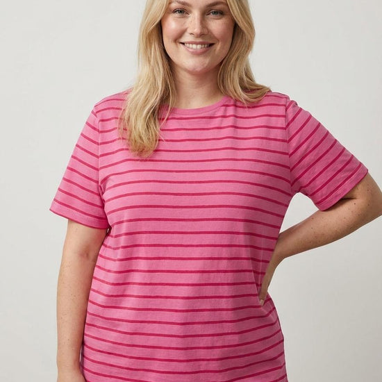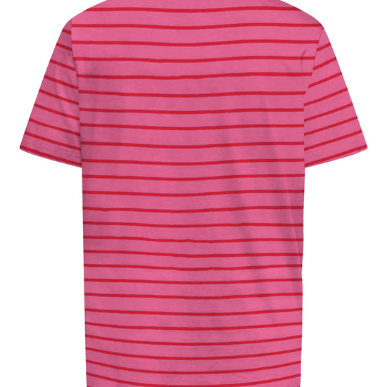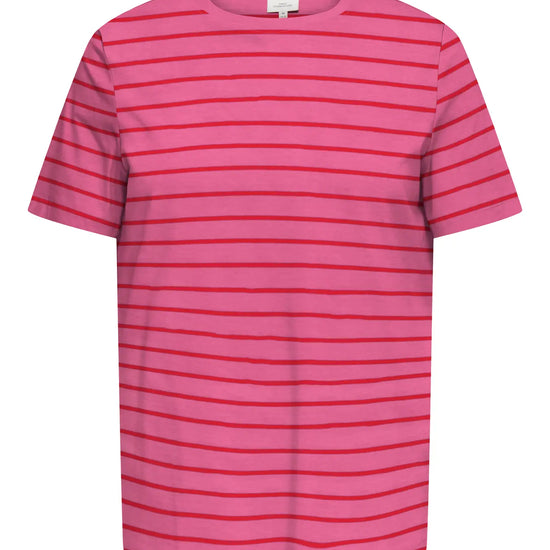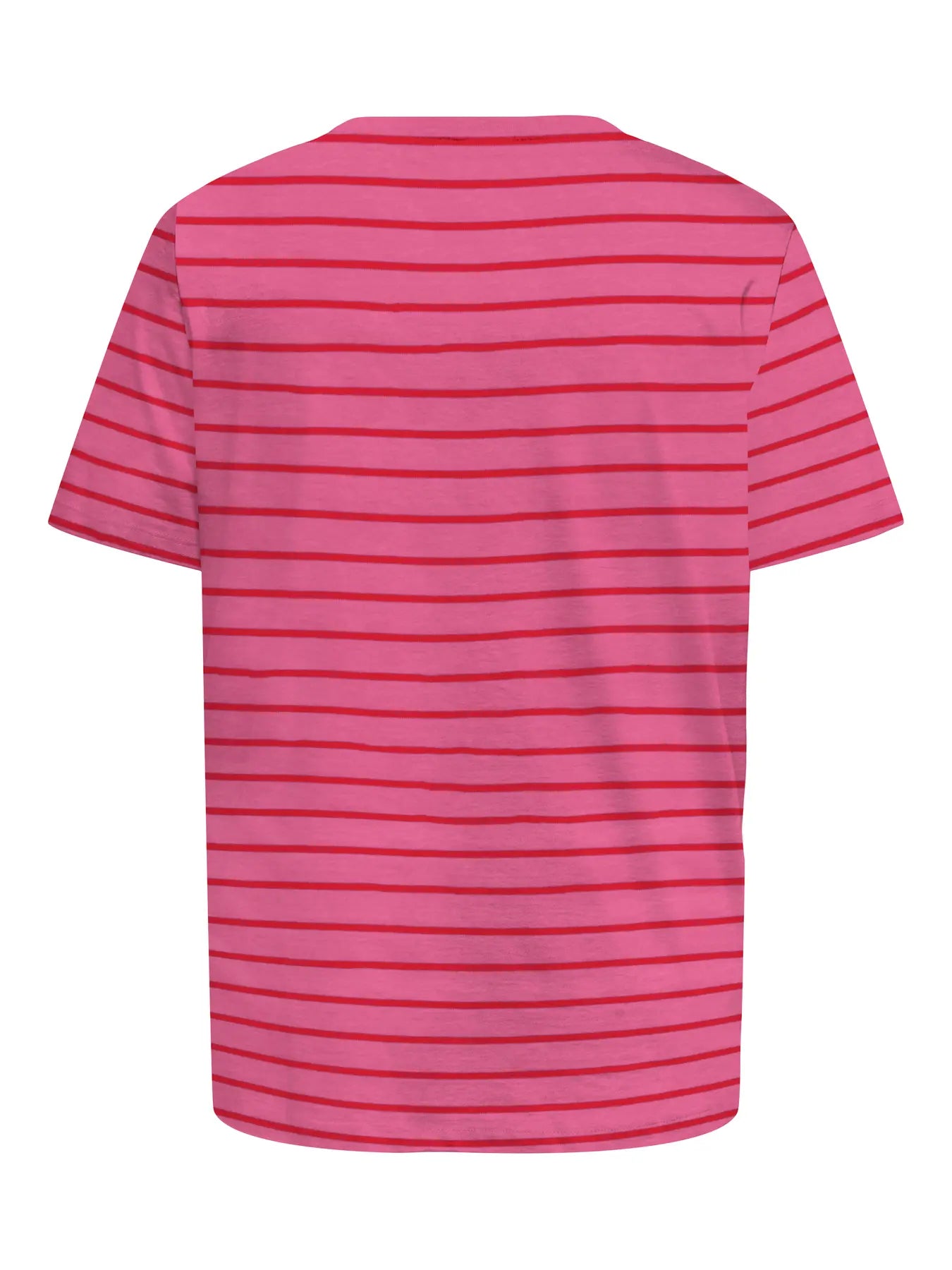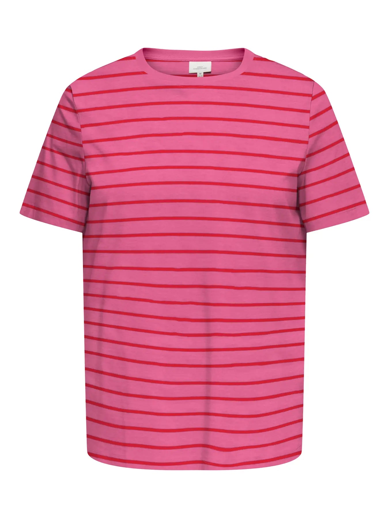 Her får du en fantastisk flot t-shirt i den smukkeste pink farve kaldet wild orchid, der prydes af smalle røde striber på tværs. Det iøjnefaldende design giver et mageløst friskt og feminint pift til din personlige garderobe. Vi har herunder samlet de bedste egenskaber ved denne smarte top fra only carmakoma, så du hurtigt kan se de vigtigste overvejelser. Du kan nemlig glæde dig over følgende skønne detaljer: