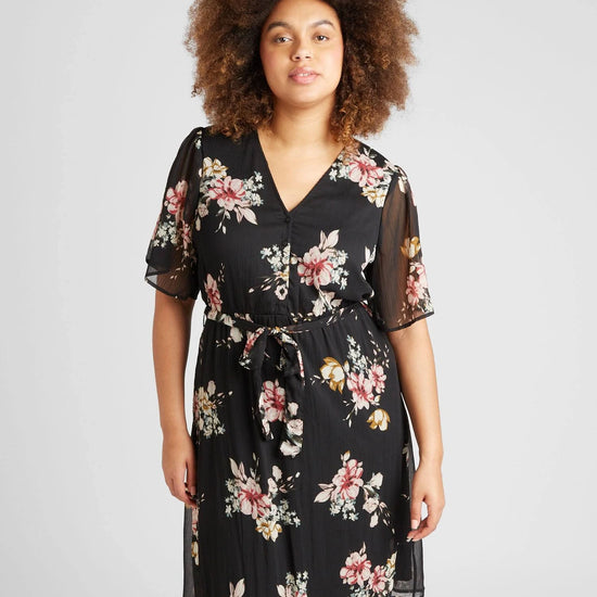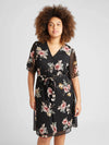 Perfekt Til Enhver Anledning Kjolens alsidighed gør den ideel til både hverdagsaktiviteter og specielle begivenheder. Det elegante bælte og den flatterende V-hals skaber et sofistikeret look, der nemt kan opgraderes med elegante accessories. Kjolen fås i størrelserne 42 til 54 og i farven 'Black ROMANTIC FLOWER', tilføjer den et romantisk og feminint touch til din garderobe.