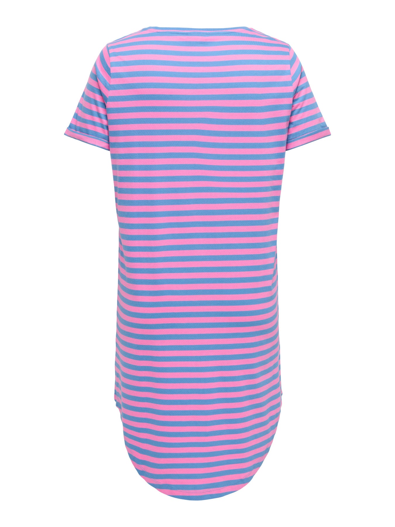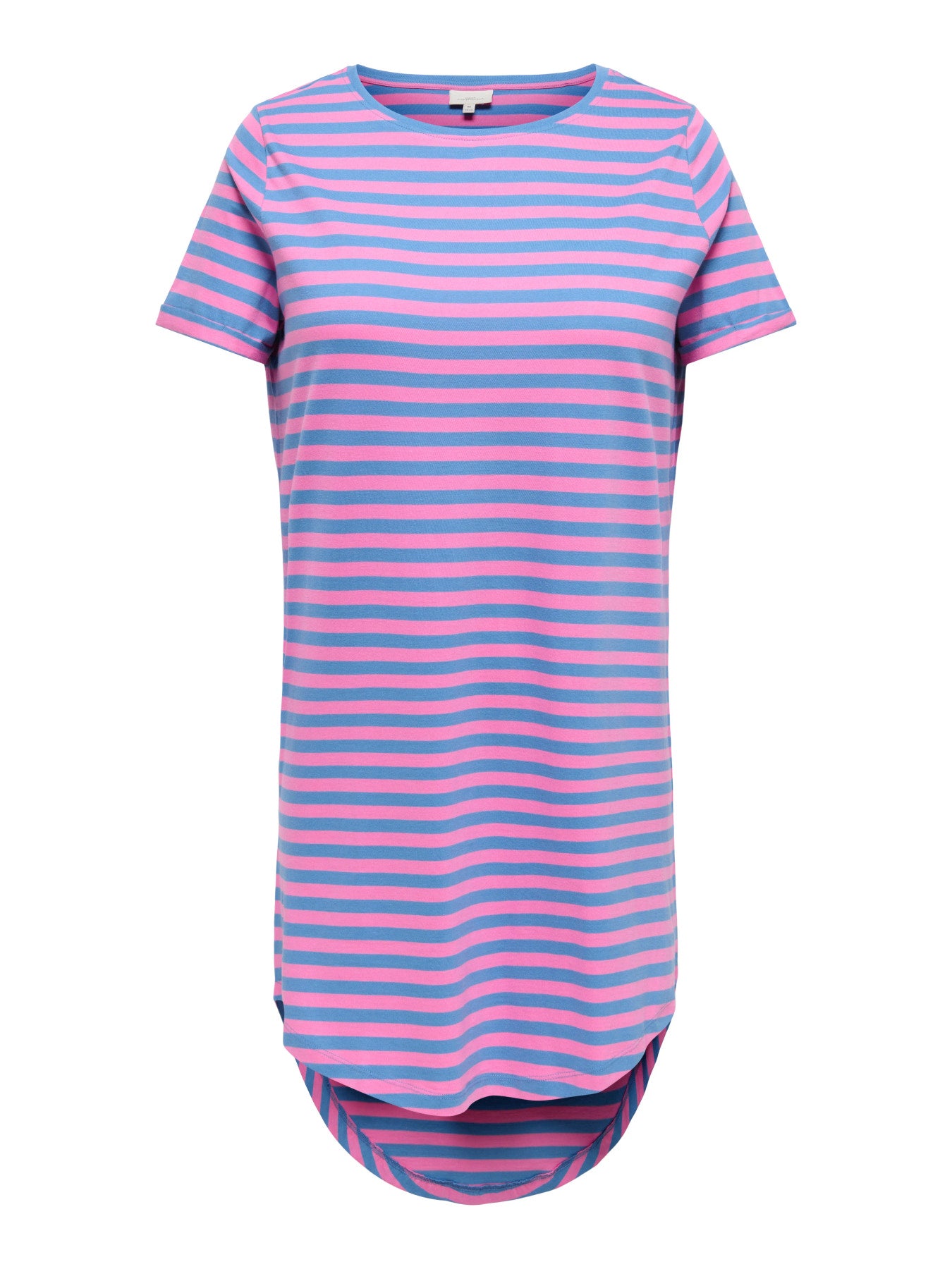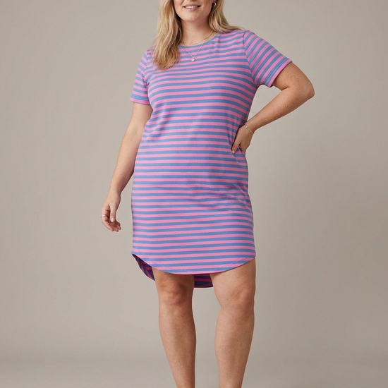 Denne farverige kjole fra Only Carmakoma er et oplagt valg til en afslappet og moderne garderobe, hvor komfort er i højsædet. Kjolen er fremstillet i blød jersey af 100% bomuld, der føles behagelig mod huden, og det stribede design i blå og lyserød tilføjer et friskt pust til dit outfit. Modellen har korte ærmer, en klassisk rund halsudskæring og en regular fit pasform, der falder pænt omkring kroppen uden at stramme.