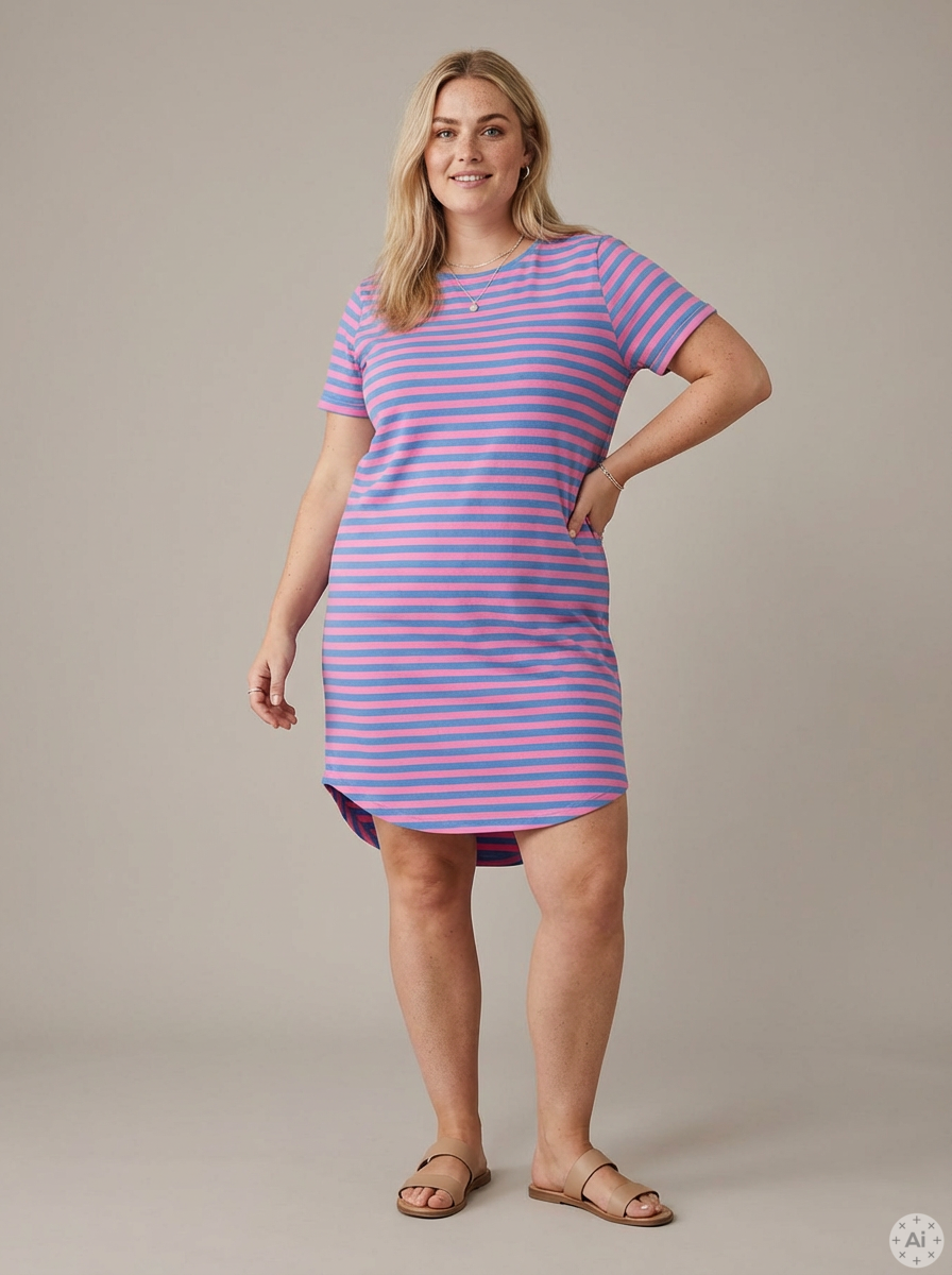Hvis du ønsker et komplet og behageligt look, kan kjolen nemt sættes sammen med et par smarte leggings og et par sneakers. De levende farver i striberne gør det let at matche med forskellige accessories, mens den strækbare kvalitet sikrer, at du føler dig godt tilpas hele dagen. Dette er en kjole, der kombinerer det afslappede udtryk fra en t-shirt med elegancen og længden fra en kjole.