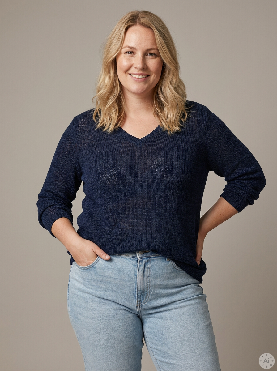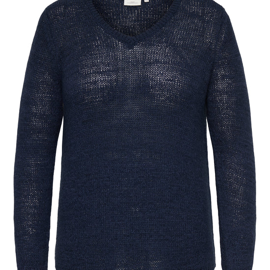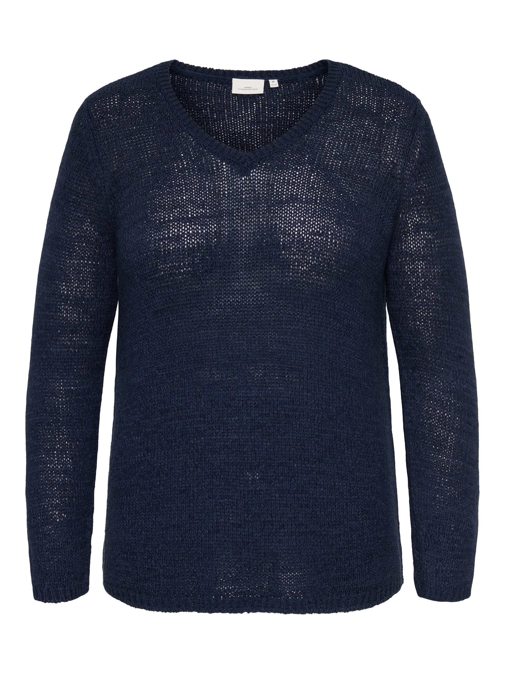 Modellen er designet med en klædelig V-hals, der åbner op omkring hals og nakke for et feminint udtryk. Denne strik fra Only Carmakoma kombinerer klassisk design med moderne komfort.