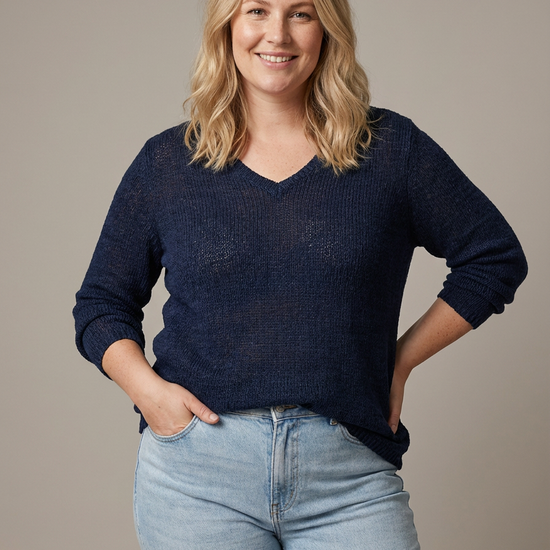 Denne pullover præsenterer sig i en dyb mørkeblå nuance, der fungerer perfekt som en tidløs base i garderoben. Strikken har en let og luftig struktur med et fint maskebillede, der giver blusen liv og sikrer en behagelig åndbarhed.