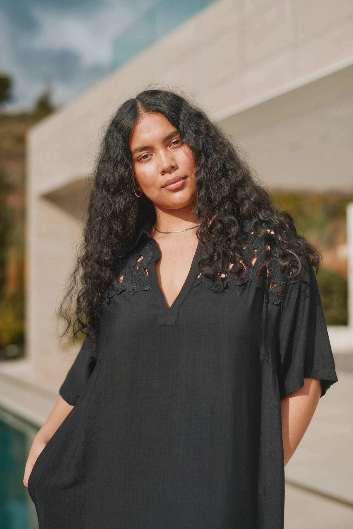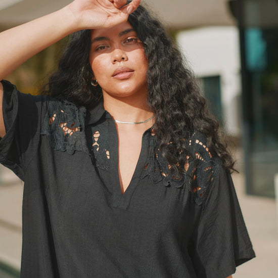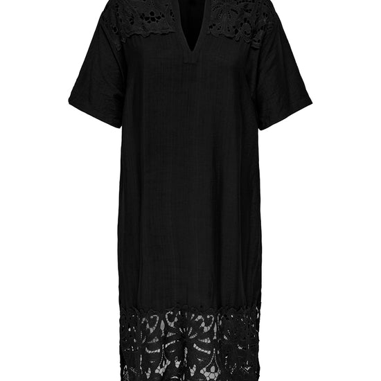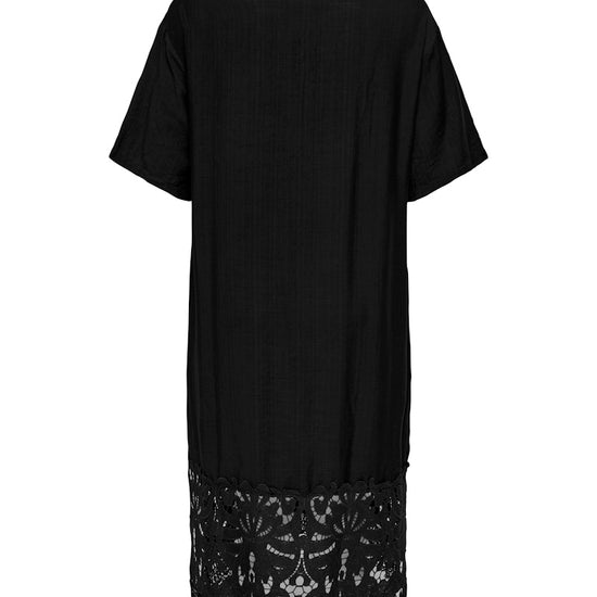 Denne smukke kjole fra Only Carmakoma er det perfekte valg til både hverdag og festlige anledninger. Designet forener det klassiske med det feminine gennem en flatterende V-udskæring, korte ærmer og delikate blondeindsatser ved skuldrene samt en bred, transparent blondekanten forneden, der giver et let udtryk.