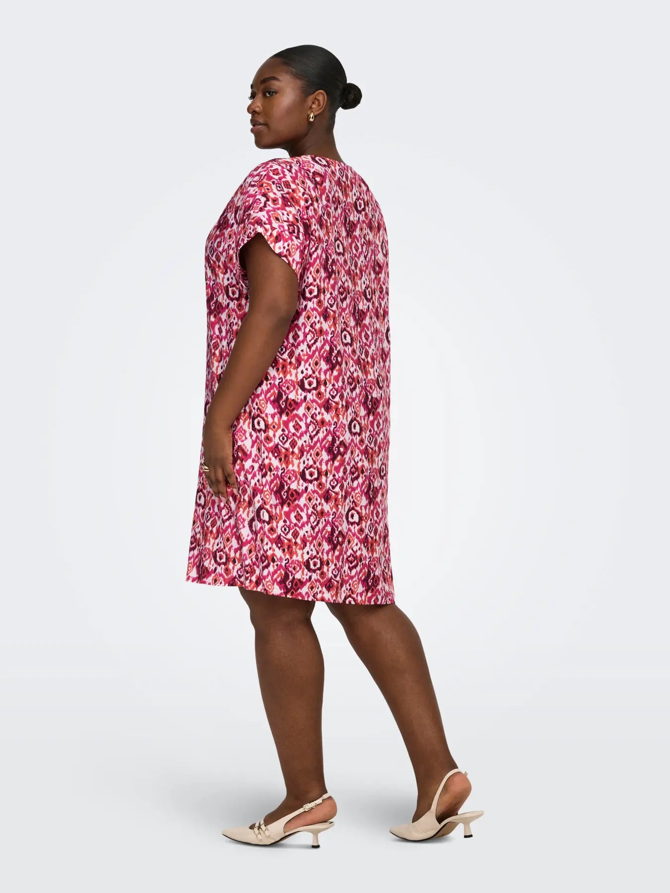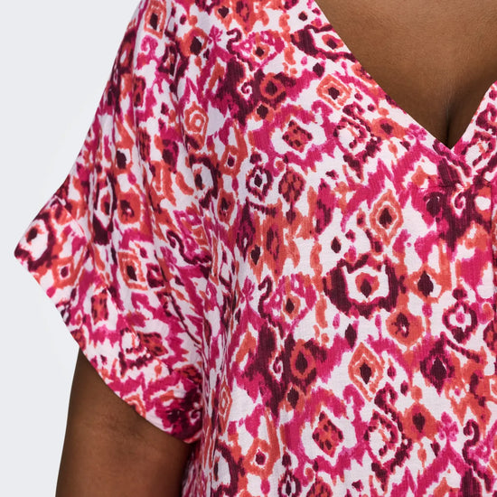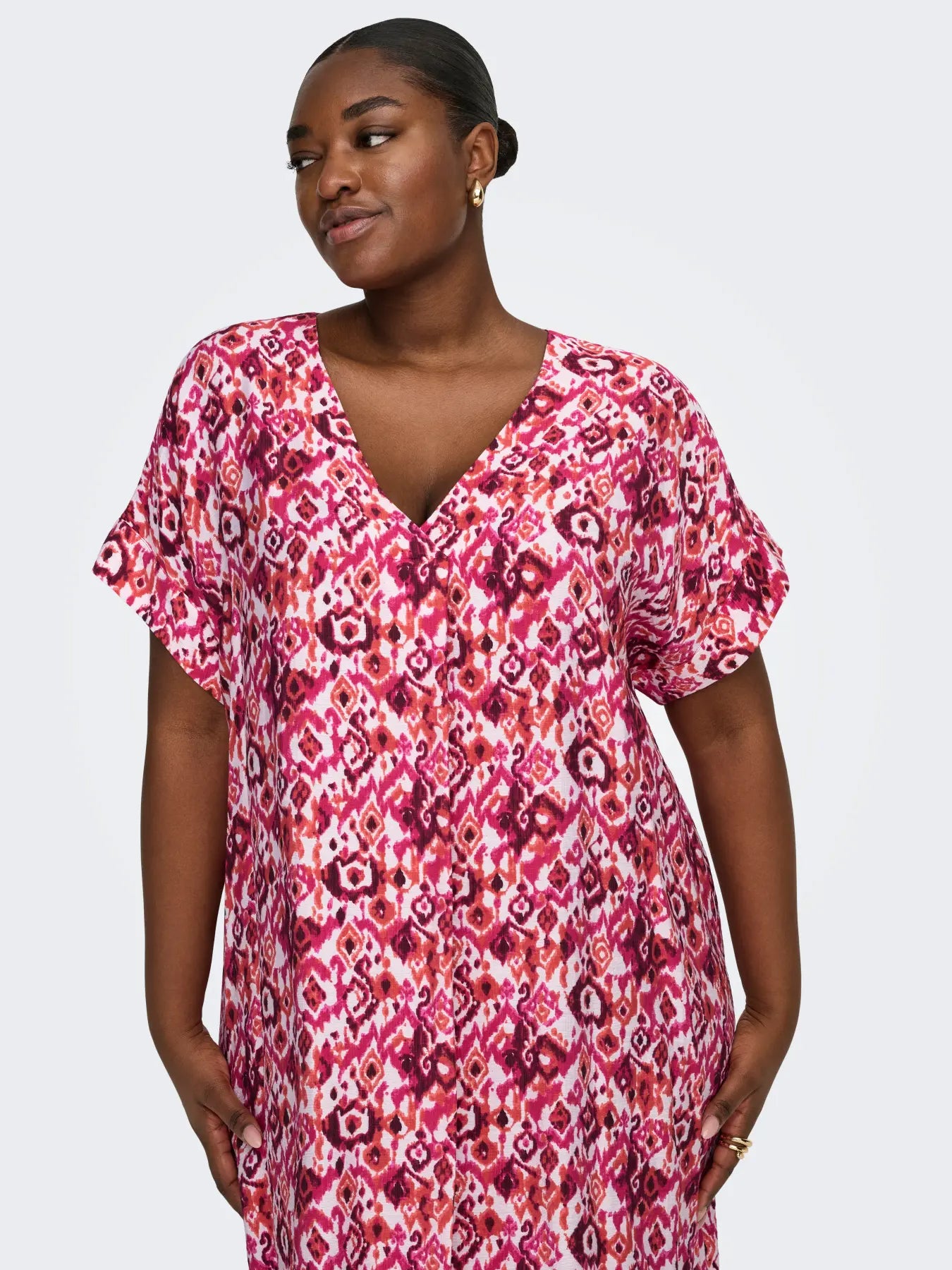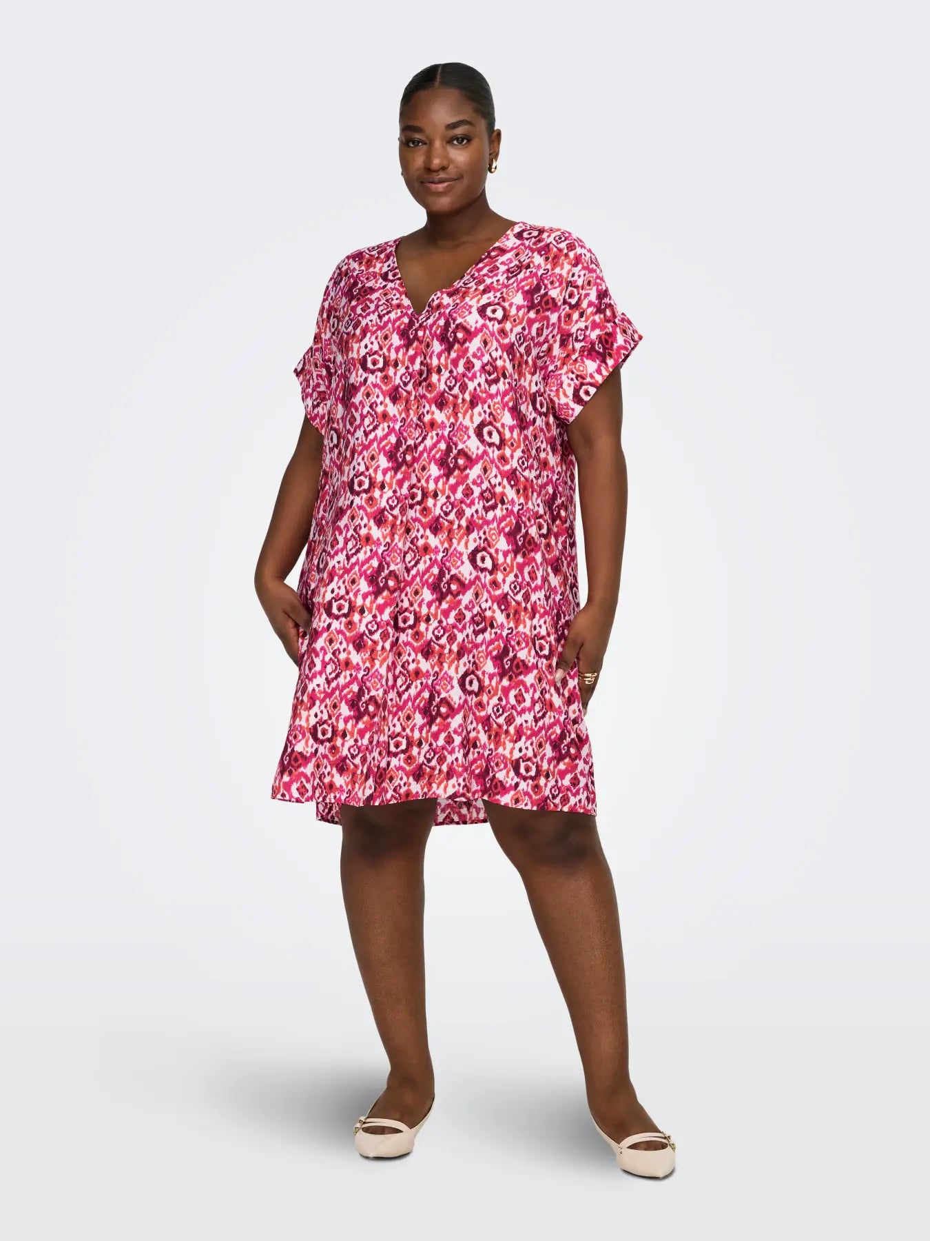 Denne v-neck kjole har et feminint og moderne snit, perfekt til den varme sæsons skiftende vejr. Den lette og bløde viskose LENZING™ ECOVERO™ blanding med polyamid sikrer en behagelig pasform og en elegant silkeblød overflade, der falder smukt omkring kroppen. Kjolen har korte ærmer med en fin fold-up detalje og en midi-længde, som giver den et afslappet men stilfuldt udtryk.