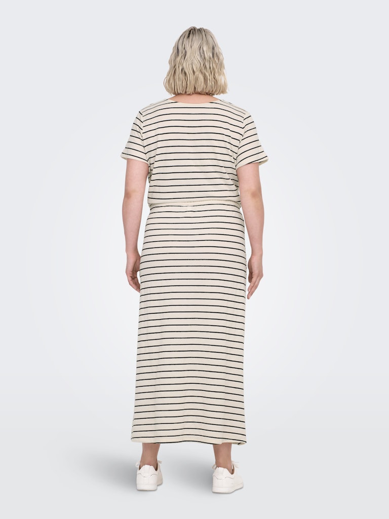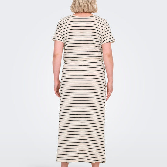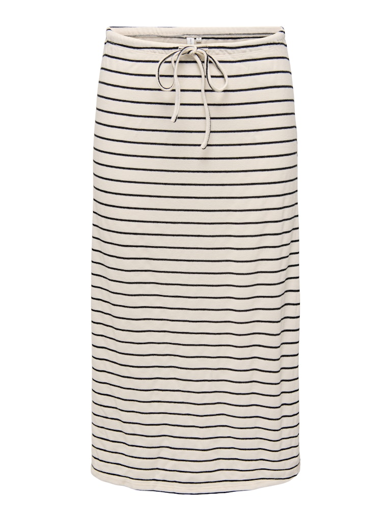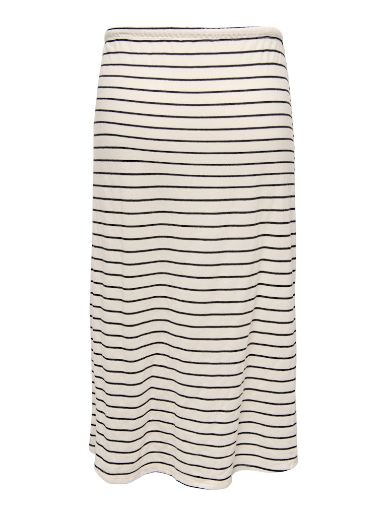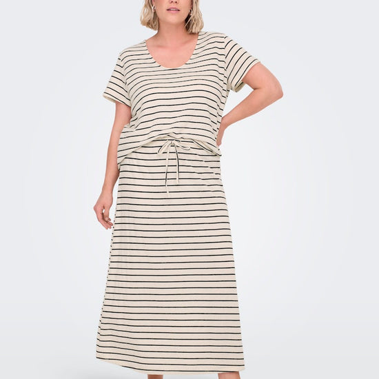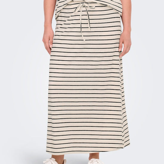 Opgrader din garderobe med denne stilfulde strikkede nederdel fra ONLY CARMAKOMA. Denne nederdel er perfekt til både arbejde, byture og hverdagsoplevelser i byen. Den er designet til at fremhæve den smukke, feminine, kurvede silhuet, og få dig til at se fantastisk ud hele dagen. Med sit klassiske stribemønster i farverne Cloud Dancer Black, passer den til enhver lejlighed.