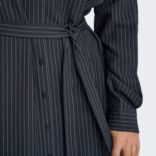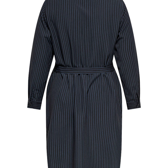 Denne skjortekjole kombinerer klassisk elegance med moderne komfort. Den skarpe krave og de lange, voluminøse ærmer med knaplukning giver et tidløst udtryk, mens det diskrete stribemønster tilføjer et ekstra lag af stil. Kjolen har en afslappet pasform, midi-længde og et justerbart bælte i taljen, så du nemt kan fremhæve din figur. Stoffet er blødt og fleksibelt, hvilket gør kjolen behagelig at have på hele dagen.