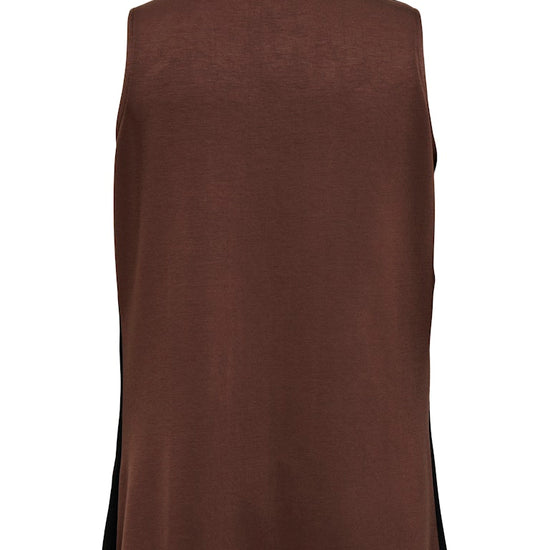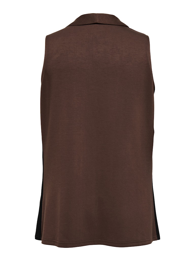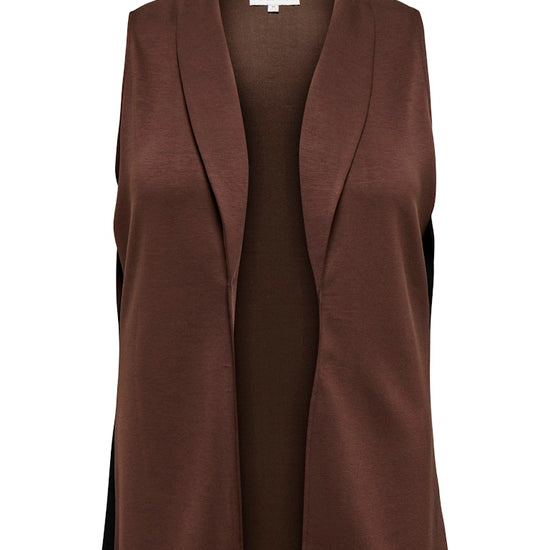 Den lange waistcoat i farven "shaved chocolate" er perfekt til dig, der ønsker et alsidigt og tidløst lag til garderoben. Den ærmeløse vest er fremstillet i en blød kvalitet af 50% polyester, 45% viskose og 5% elastan, hvilket sikrer høj komfort og en fleksibel pasform. Det enkle, elegante design gør den let at style til både hverdag og mere festlige anledninger.