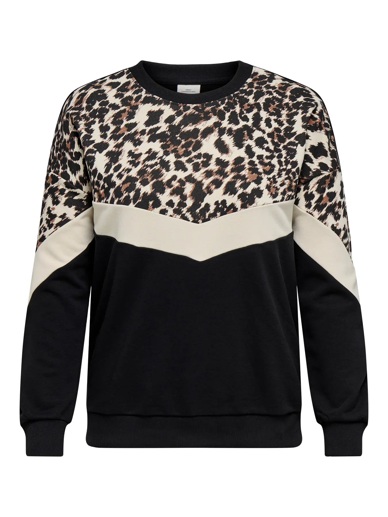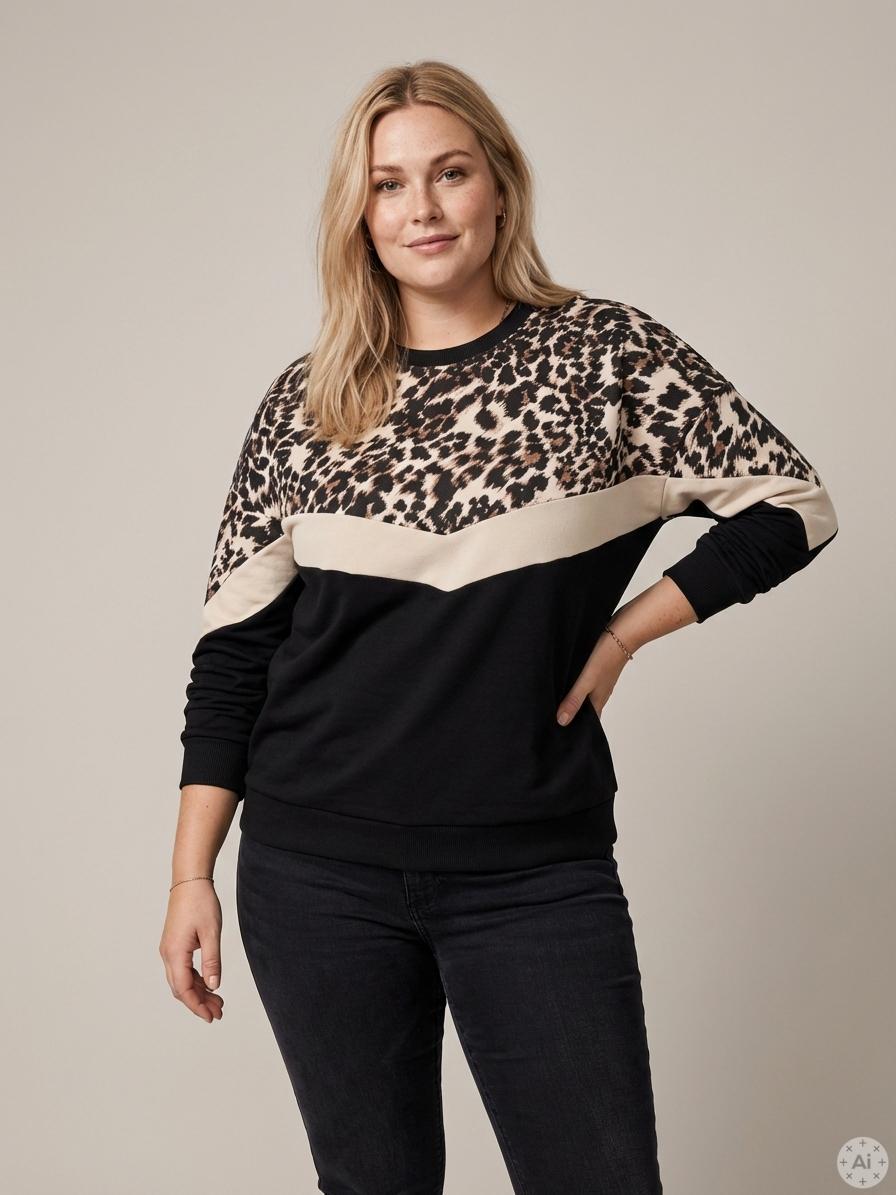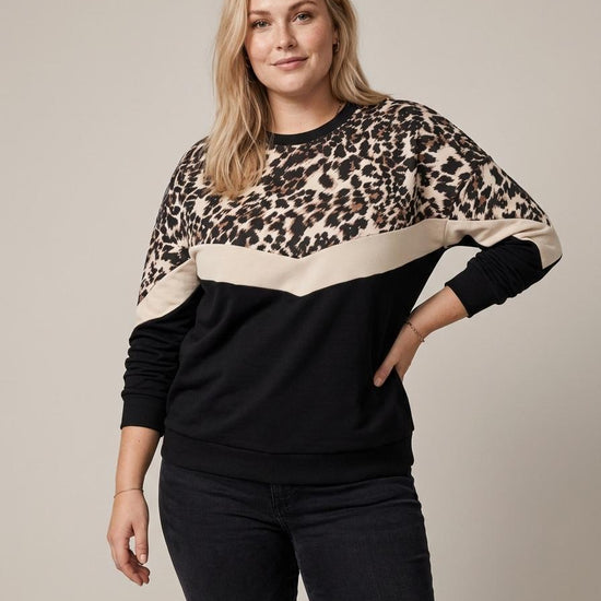 Denne iøjnefaldende overdel fra Only Carmakoma skaber et stærkt visuelt udtryk med sit smarte colorblock-design, der kombinerer klassisk sort med en lys v-formet stribe og et råt dyreprint øverst. Modellen er designet med en rund halsudskæring samt brede ribkanter ved både ærmer og hofte, hvilket giver et sporty og gennemført look. Den bløde kvalitet og de sænkede skuldre sikrer en afslappet silhuet, der føles behagelig at have på hele dagen.