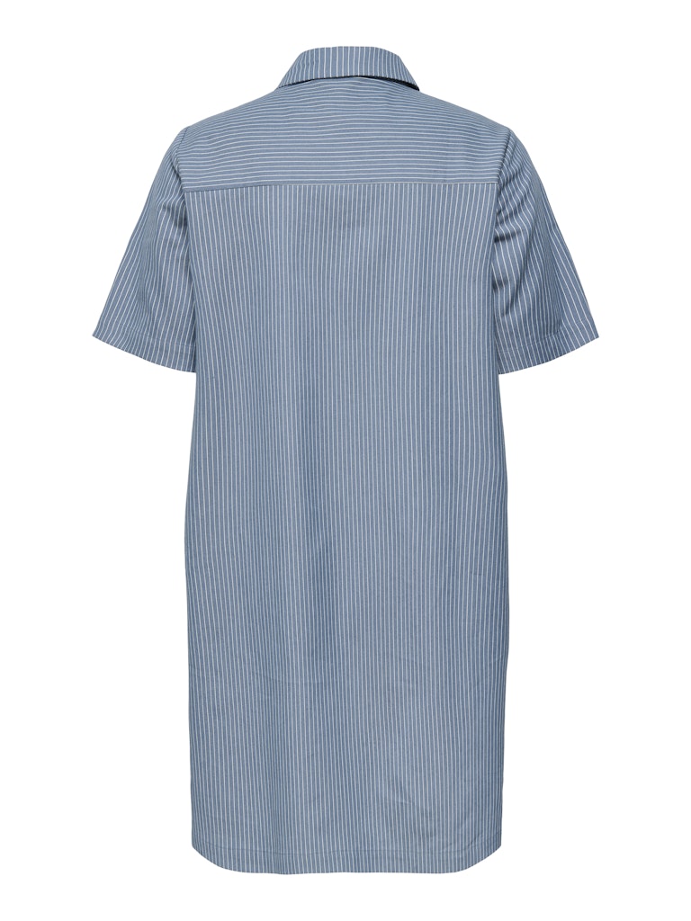 Den klassiske blå nuance kombineret med hvide striber giver kjolen et tidløst udtryk, der er let at matche med forskellige accessories. Den vævede struktur i plain weave sikrer, at kjolen både er holdbar og behagelig at bære.