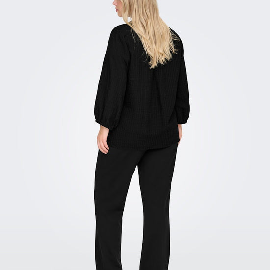Skab et blødt og stilfuldt udtryk med denne smukke top fra ONLY CARMAKOMA. Toppen er designet i et vævet stof, hvor flere garner er kombineret for et tidløst og eksklusivt look. Den har en flatterende V-hals, 3/4-lange ballonærmer med elastiske manchetter samt en regular pasform, der giver både komfort og en feminin silhuet.