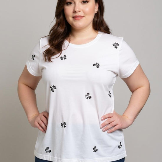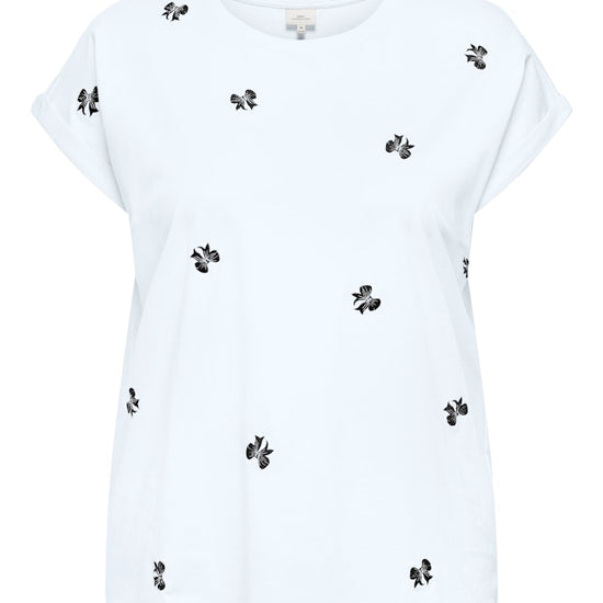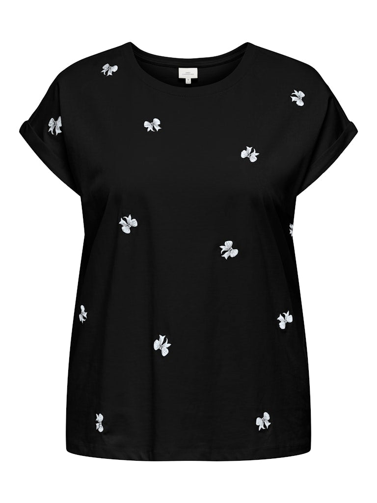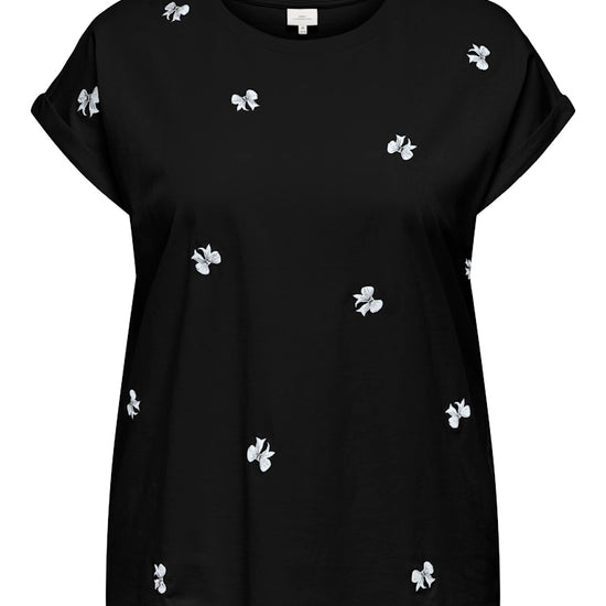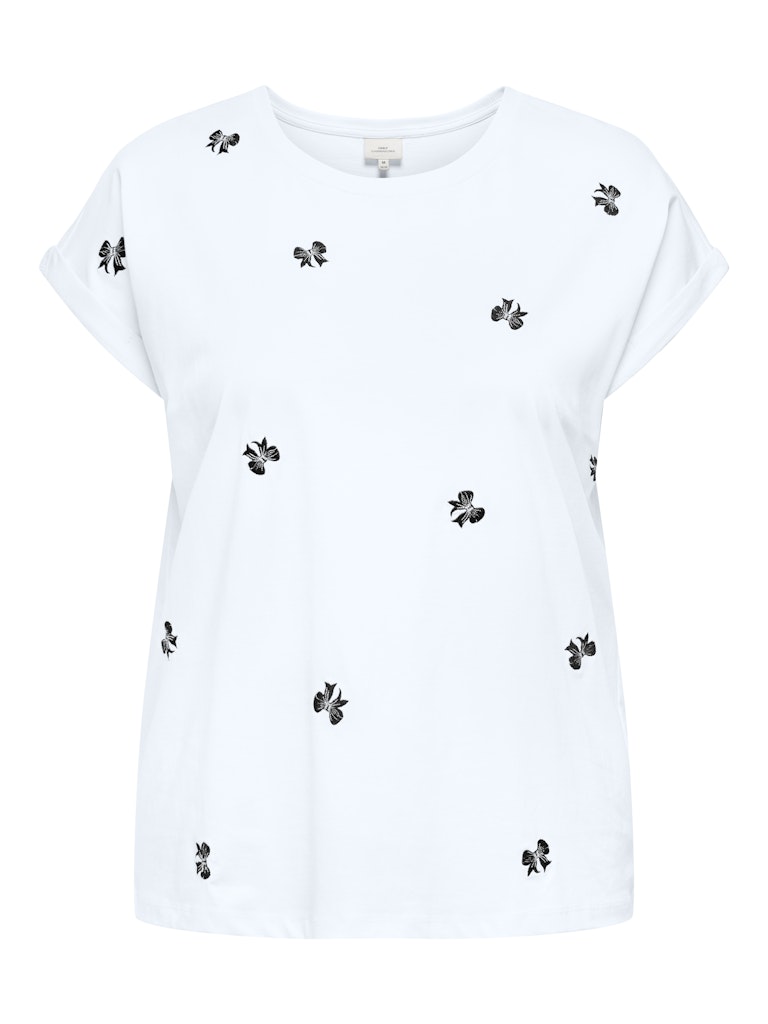 Oplev den elegante kombination af komfort og stil med denne smukke T-shirt fra ONLY CARMAKOMA. Denne T-shirt er perfekt til dig, der ønsker et klassisk og feminint look. Med fine broderede sløjfer i sort, der pryder den hvide baggrund, får du en T-shirt, der skiller sig ud med sine delikate detaljer.