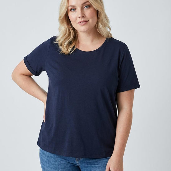 Denne mørkeblå t-shirt er en alsidig tilføjelse til garderoben, hvor det enkle design får et moderne løft gennem de korte ærmer med faste opsmøg. Modellen har en klædelig rund halsudskæring, og den bløde jerseykvalitet sikrer, at toppen falder pænt og behageligt omkring kroppen. Du finder her en style fra ONLY Carmakoma, der vægter både pasform og udtryk højt.