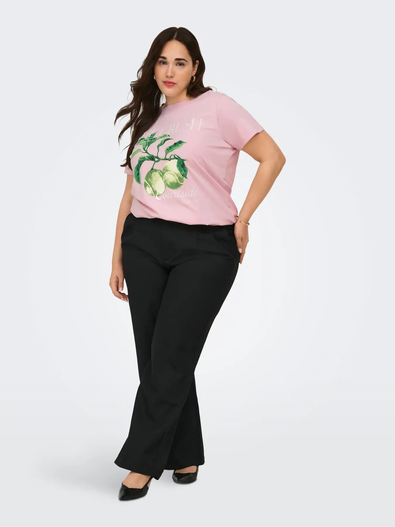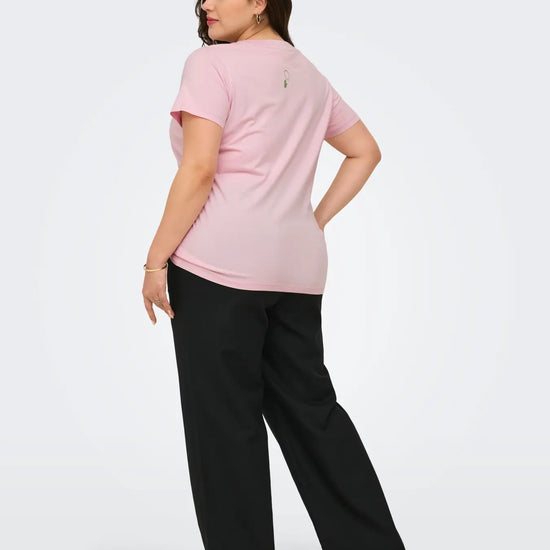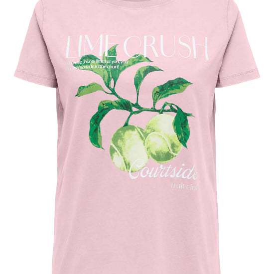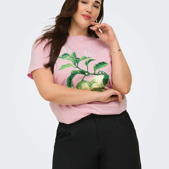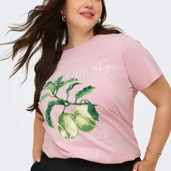 Denne feminine og lyserøde t-shirt er en fantastisk tilføjelse til din garderobe. Den byder på et iøjnefaldende frontprint, hvor flotte grønne tennisbolde hænger som friske frugter på en gren, omkranset af hvid tekst som lime crush og courtside. Vores store udvalg af only carmakoma t-shirts byder på mange skønne designs, og denne model i en blød og åndbar bomuldskvalitet er bestemt ingen undtagelse. Hvis du leder efter smarte og komfortable t-shirts i plus size, får du her en fantastisk pasform der sidder rigtig flot på figuren.
