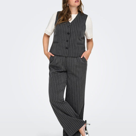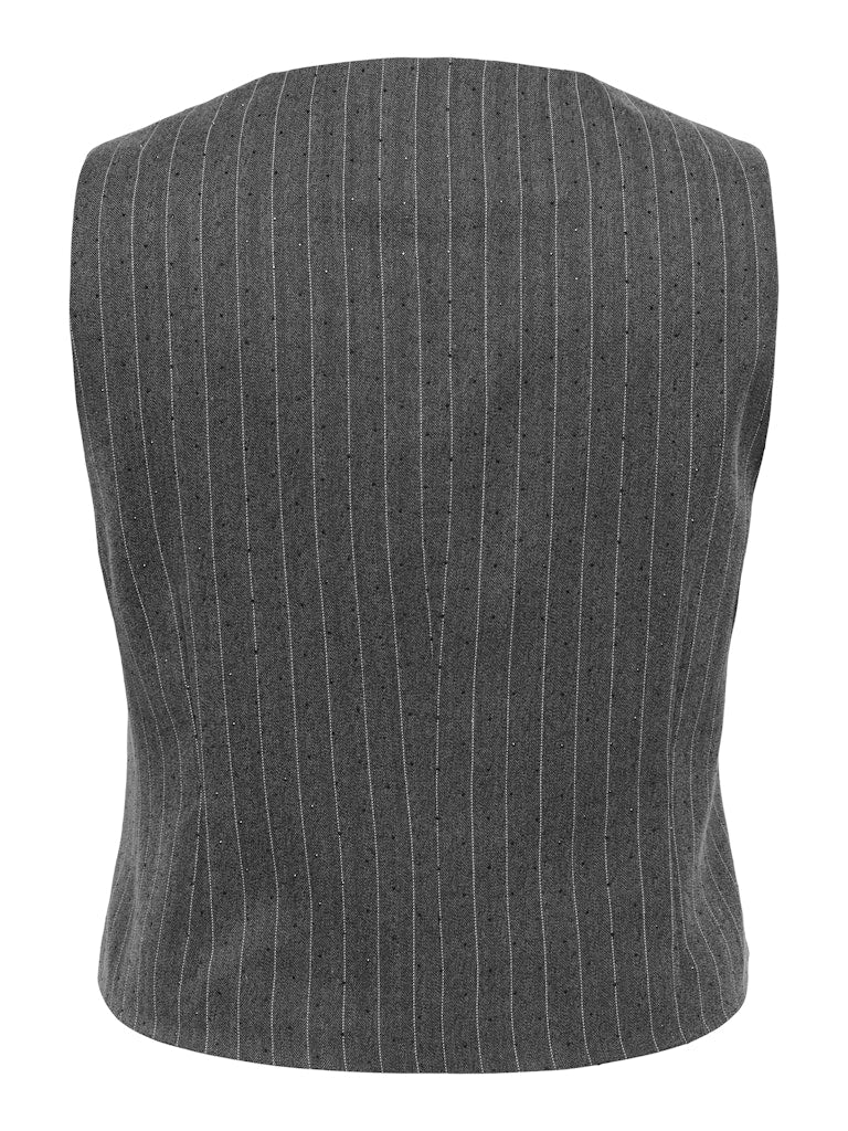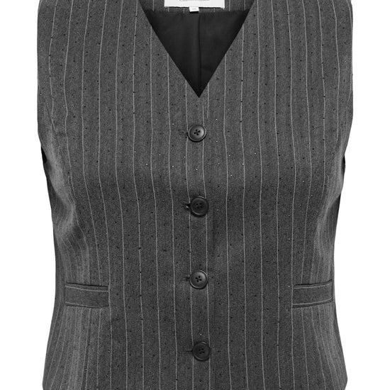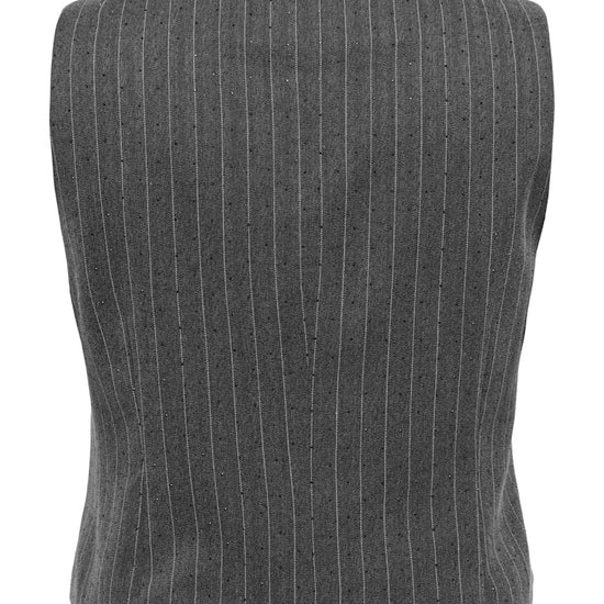 Giv din garderobe et løft med denne skræddersyede waistcoat, der kombinerer klassisk snit med moderne detaljer. Den mørkegrå melange farve med hvide pinstripes og fine rhinsten tilfører et eksklusivt og elegant udtryk, der passer perfekt til både hverdag og fest. Vesten er fremstillet i en blød og fleksibel kvalitet, der sikrer komfort hele dagen.