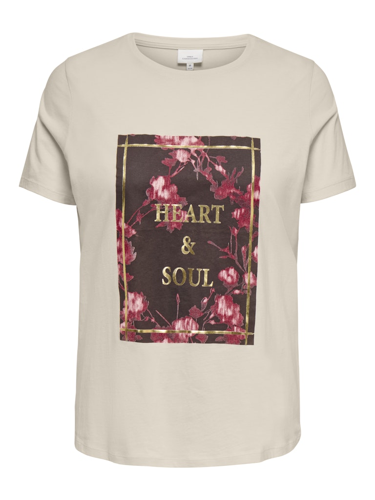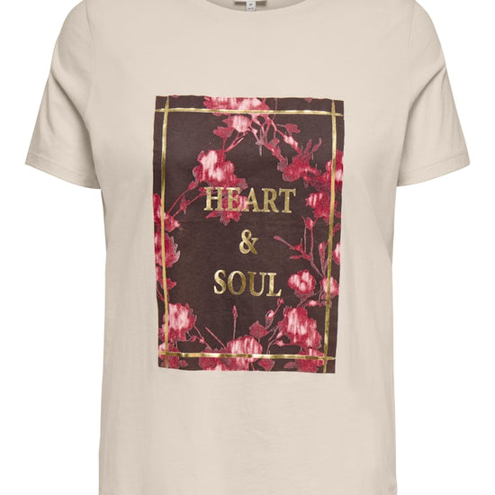 Forkæl dig selv med denne elegante T-shirt i den lyse Birch-tone, der kombinerer komfort og stil. Den regular fit pasform, de korte ærmer og den runde hals giver et afslappet og moderne look, mens det eksklusive blomsterprint med teksten "HEART & SOUL" tilføjer et unikt og inspirerende twist.