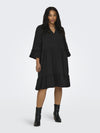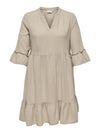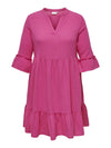 Denne ONLY CARMAKOMA peplum kjole er skabt til at fremhæve alle fordelene ved den smukke og kurvede silhuet. Den er fremstillet i 100% økologisk bomuld, hvilket sikrer en blød og behagelig oplevelse hele dagen. Den er etagesyet og har 3/4 lange ærmer og flot v-hals.