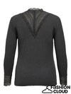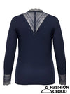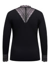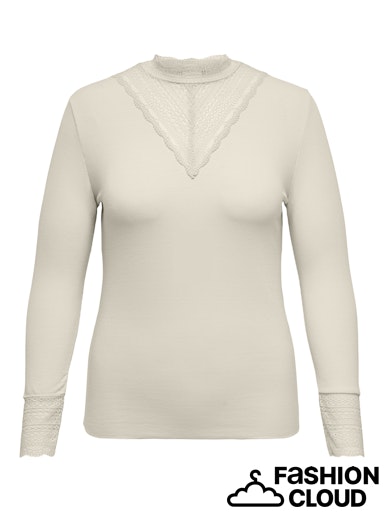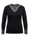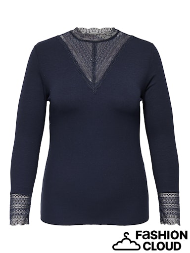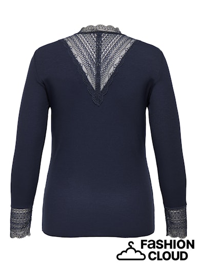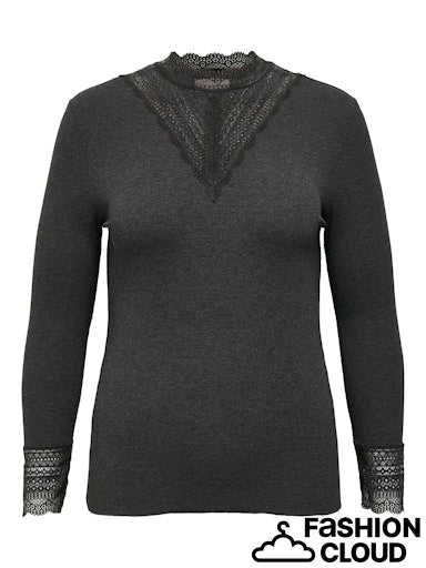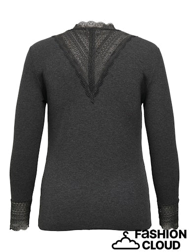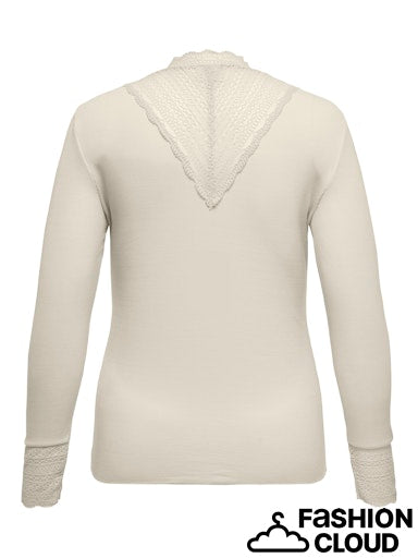 - Høj blondehals med V-hals design, der tilføjer et feminint touch.