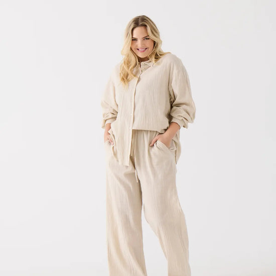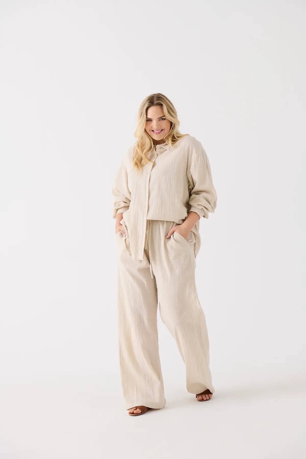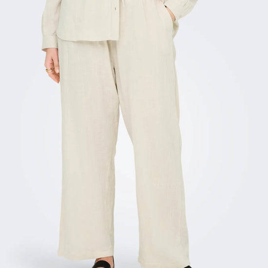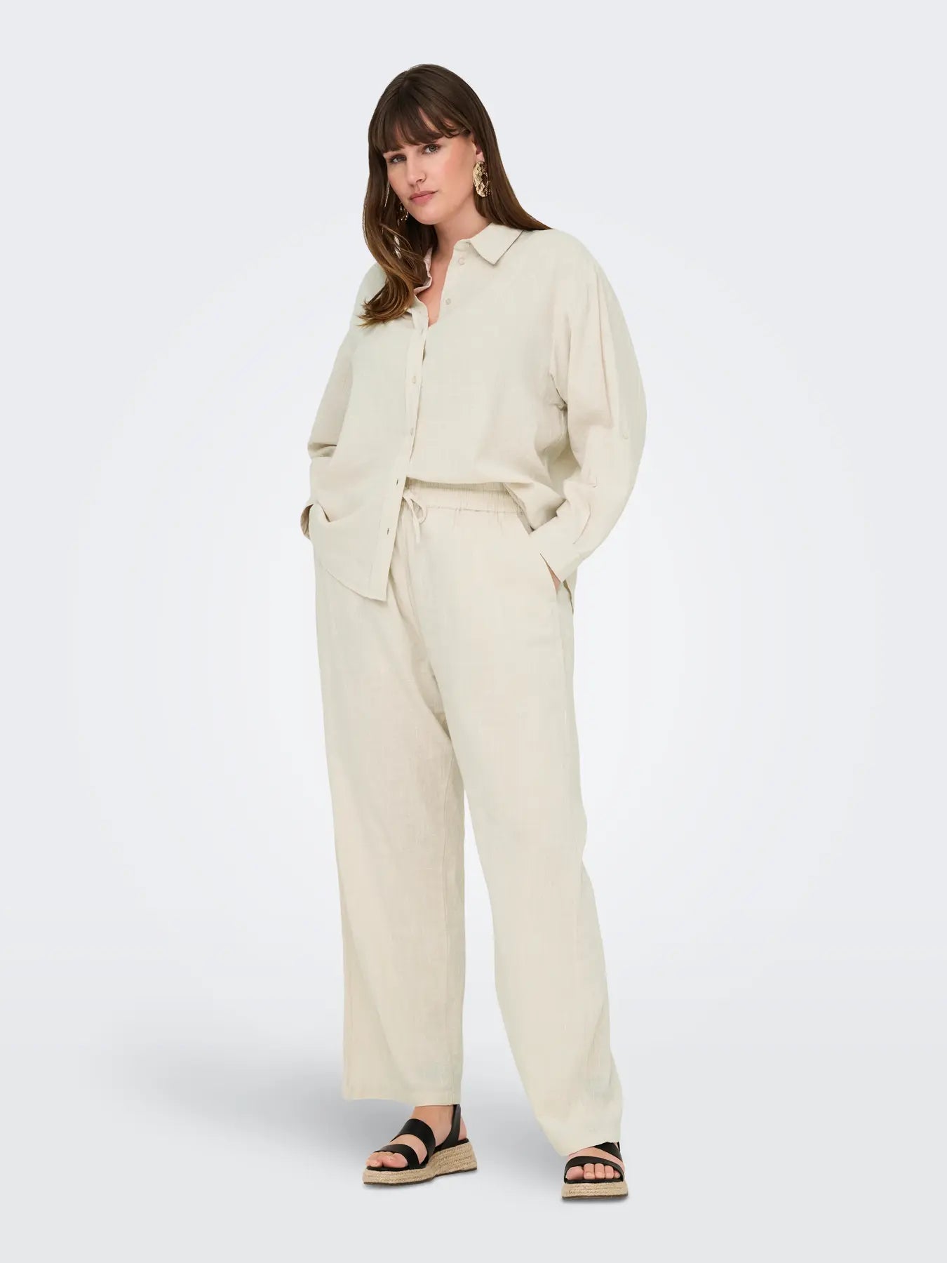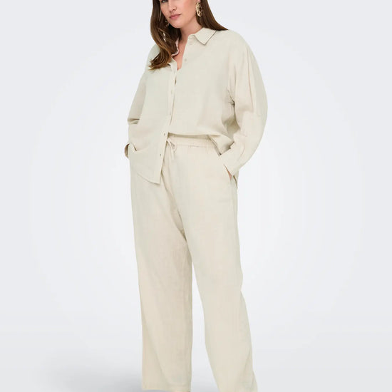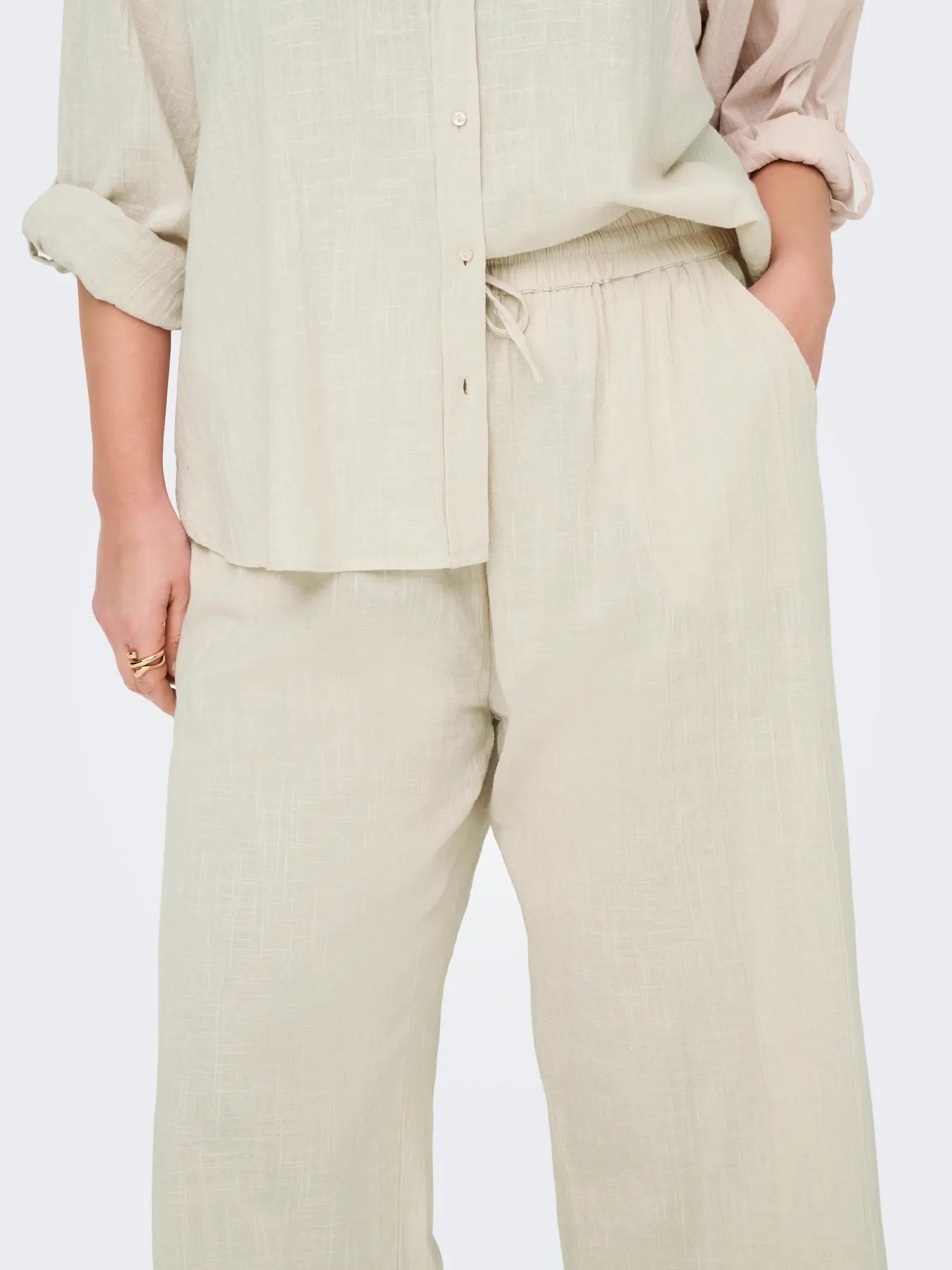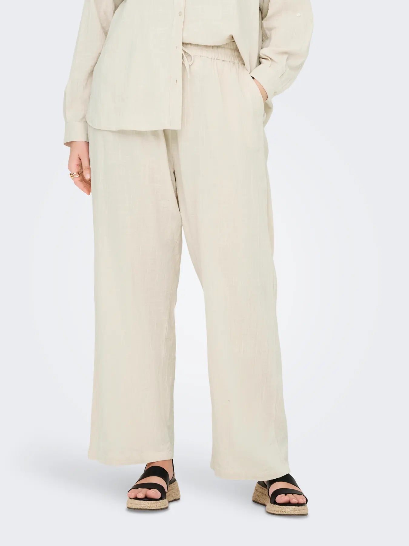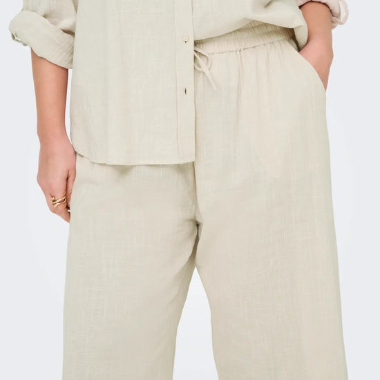 Gør plads i garderoben til disse alsidige bukser fra ONLY CARMAKOMA, der kombinerer komfort og stil på bedste vis. Disse bukser er fremstillet af 100% bomuld, der sikrer en let og åndbar oplevelse. Med en neutral 'Pumice Stone' farve er de nemme at matche med forskellige outfits. Den elastiske talje med snøre lukning gør det muligt at justere pasformen for ekstra komfort.