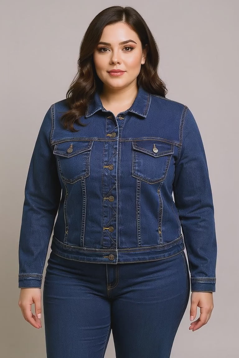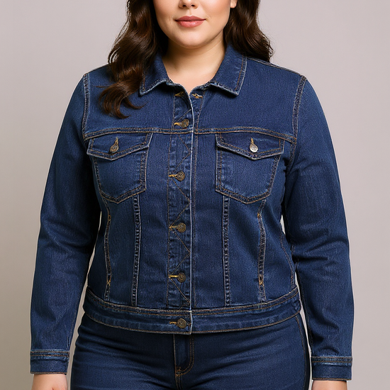Denimjakken er tilgængelig i størrelserne 46, 48, 50, 52 og 54, hvilket gør den ideel for enhver kvinde, der ønsker en komfortabel og stilfuld pasform. Dens klassiske design gør den nem at kombinere med både plus size jeans og toppe for et komplet og trendy look.