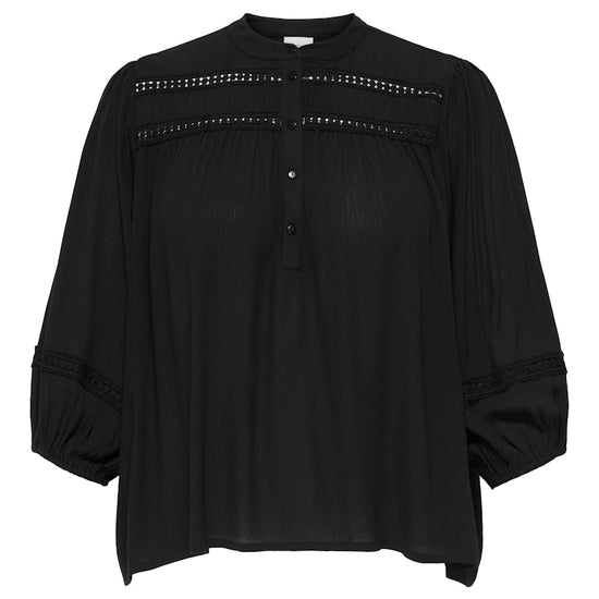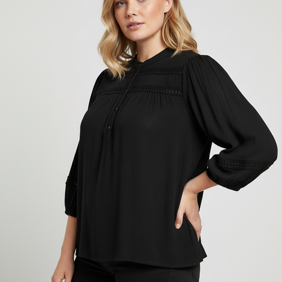Blusen kan nemt matches med et par plus size bukser eller en nederdel for et fuldendt look, der passer både til arbejde og festlige lejligheder. Giv din garderobe et løft med denne sorte bluse, der kombinerer tidløs elegance med unikke detaljer.