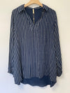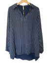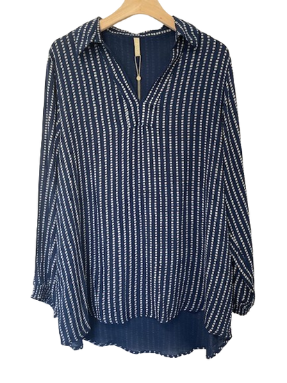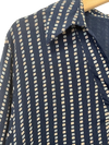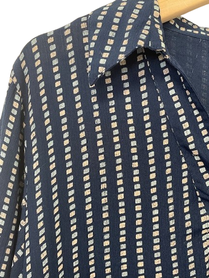 Smuk bluse fra Cassiopeia med åbning ned foran og krave. Blusen har lange ærmer med elastik forneden. Stoffet er crepe viskose og blusen har små firkantede tryk.