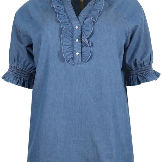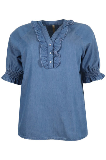 Feminin bluse fra Cassiopeia med flæsekant rundt i stolpe lukningen. Blusen har korte ærmer med elastik afslutning. Let denim kvalitet.