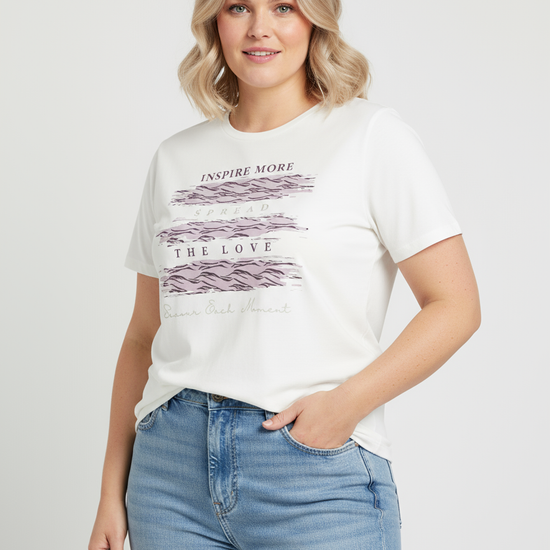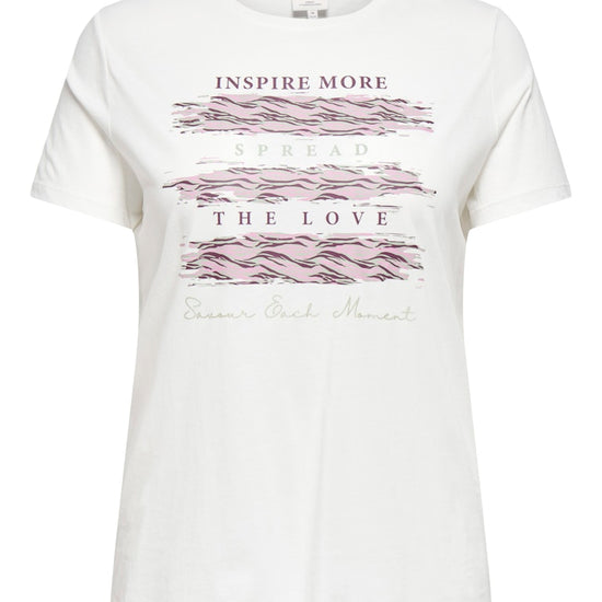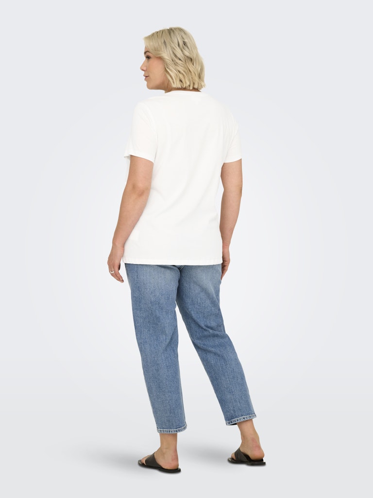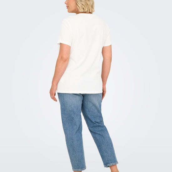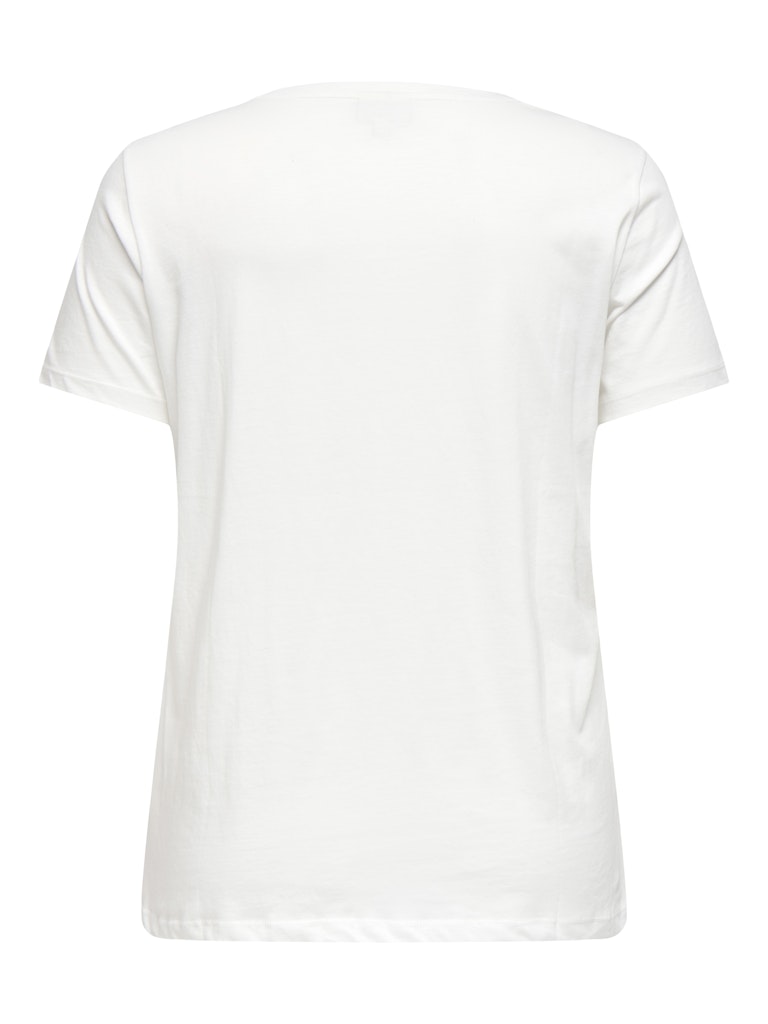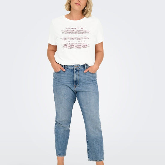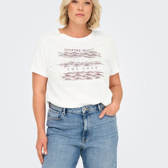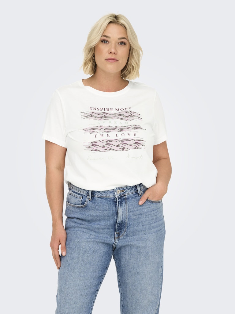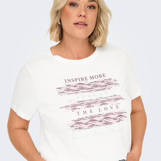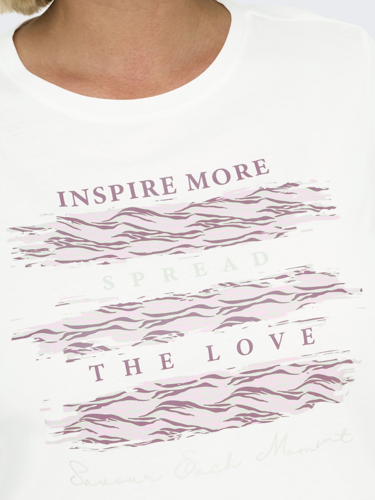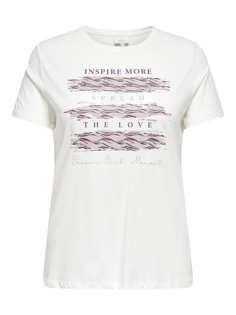 Denne T-shirt fra ONLY CARMAKOMA er skabt i 100% økologisk bomuld, hvilket sikrer en ekstra blød og åndbar oplevelse dagen igennem. Det klassiske snit med rund hals og korte ærmer giver en behagelig regular pasform, mens farven "Cloud dancer" og det fine mønster kombineret med inspirerende tekst skaber et flot, personligt udtryk.