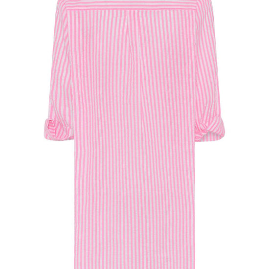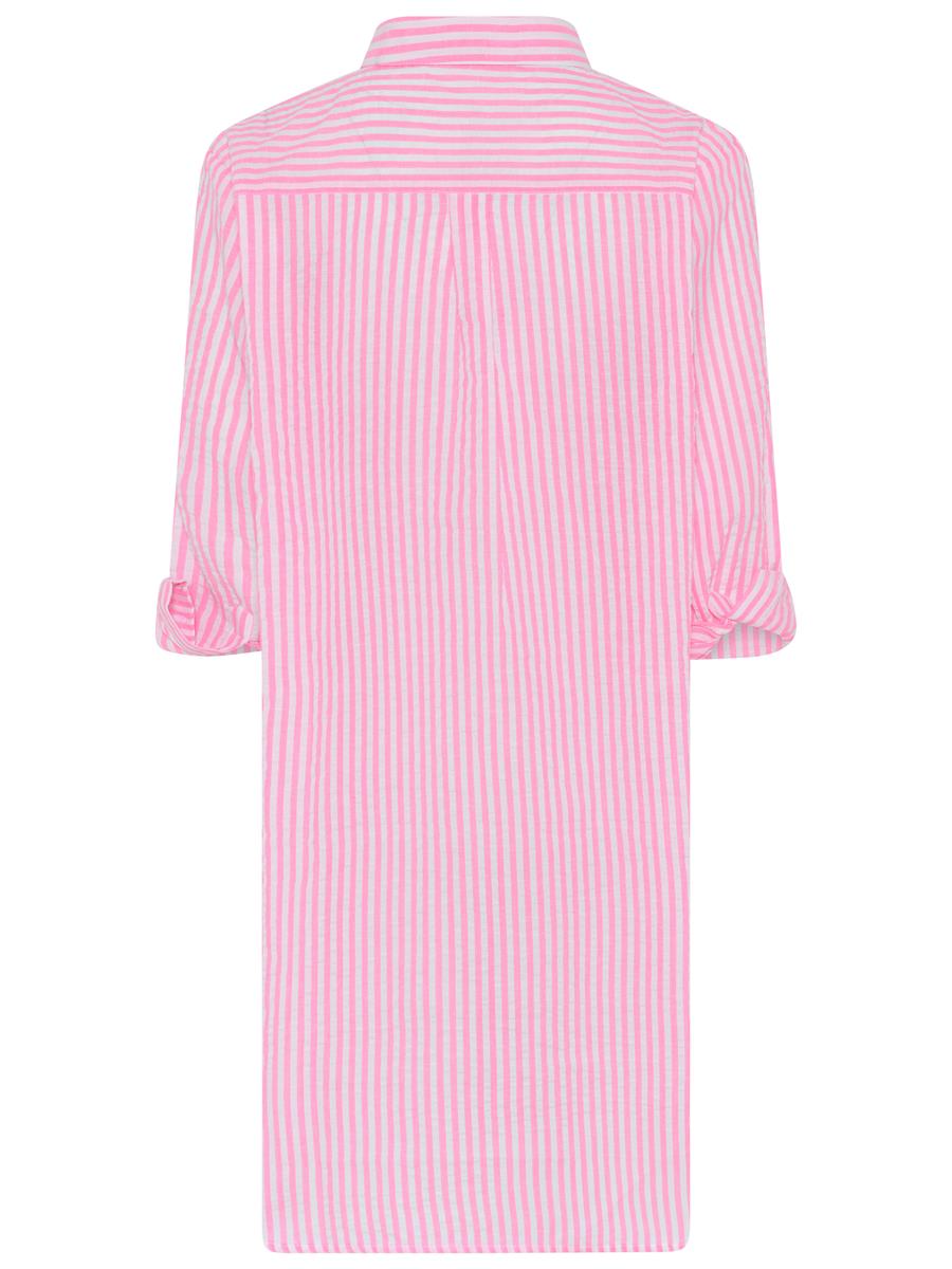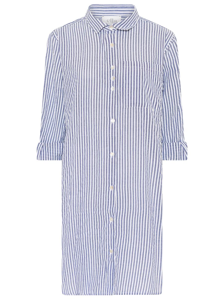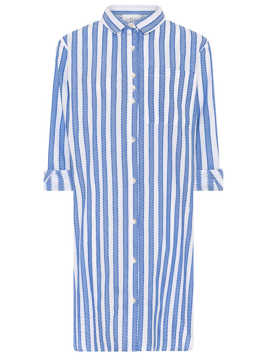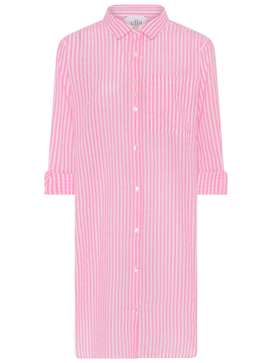 Oplev denne smarte, lange skjorte fra Etage, der kombinerer komfort og stil på bedste vis. Skjorten er lavet af 100% bomuld, hvilket sikrer en blød og behagelig følelse mod huden. Den fås i tre iøjnefaldende farvekombinationer: lyserød stribet, blå stribet og Blue Iris stribet, hvilket giver dig mulighed for at vælge den stil, der passer bedst til din garderobe.