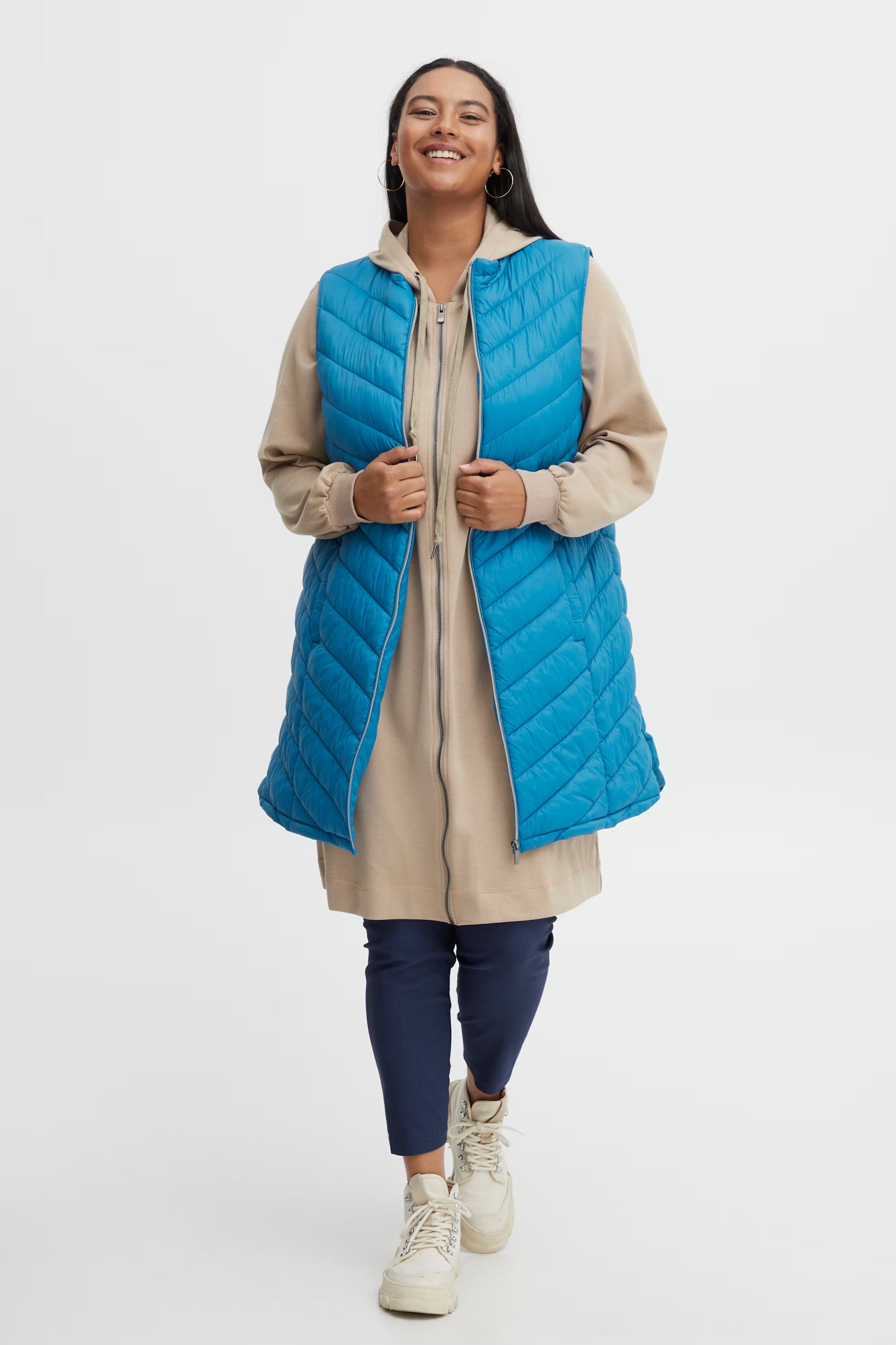 Vesten er designet til at passe til både hverdag og fritid, og den marineblå nuance matcher nemt dine øvrige favoritter. Brug den sammen med plus size bukser eller en blød strik for et afslappet, men velklædt look. En must-have til garderoben, når komfort og mode skal gå hånd i hånd.